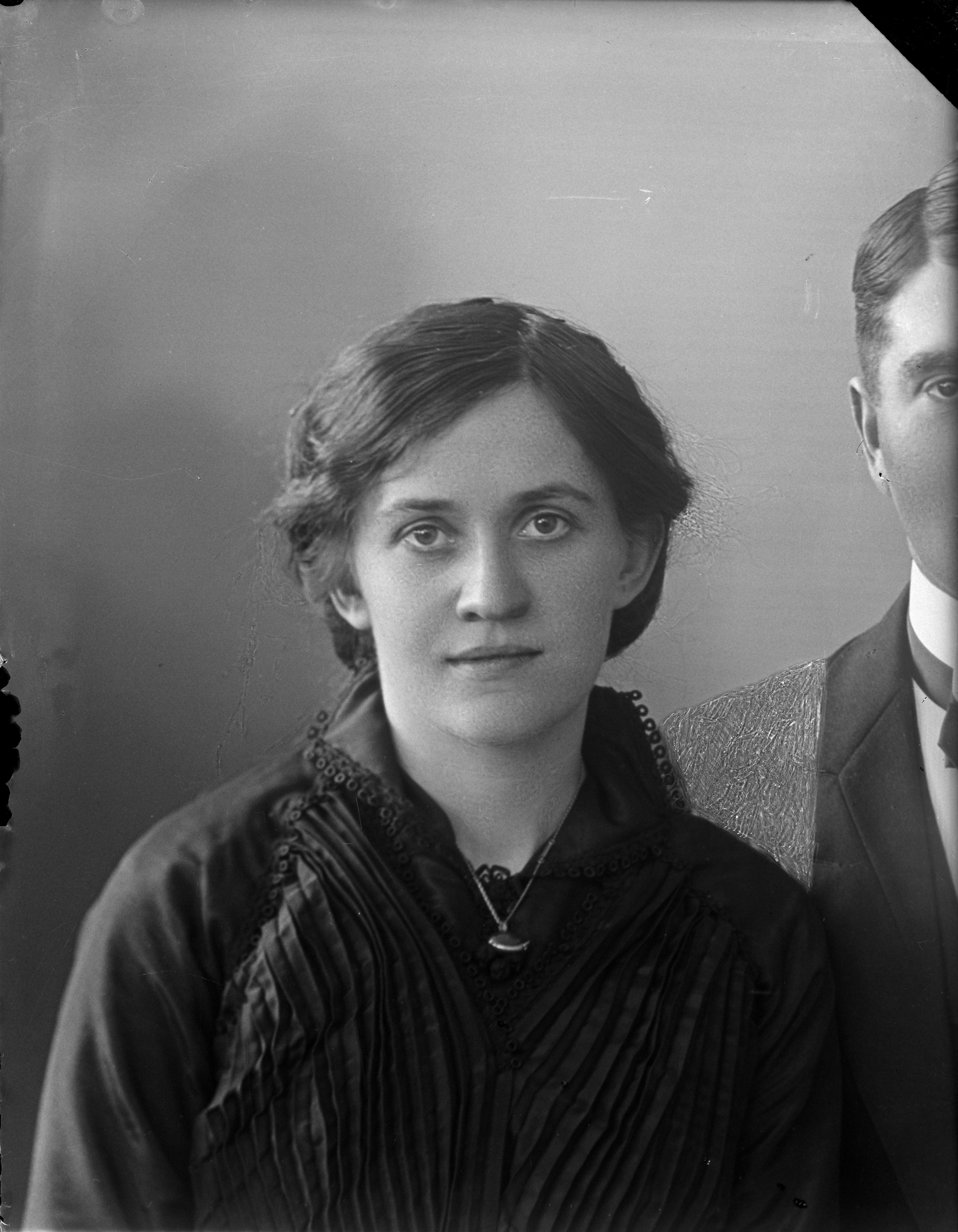 Beskrivning: Porträtt i halvfigur av fru Larsson. Del av parporträtt.
