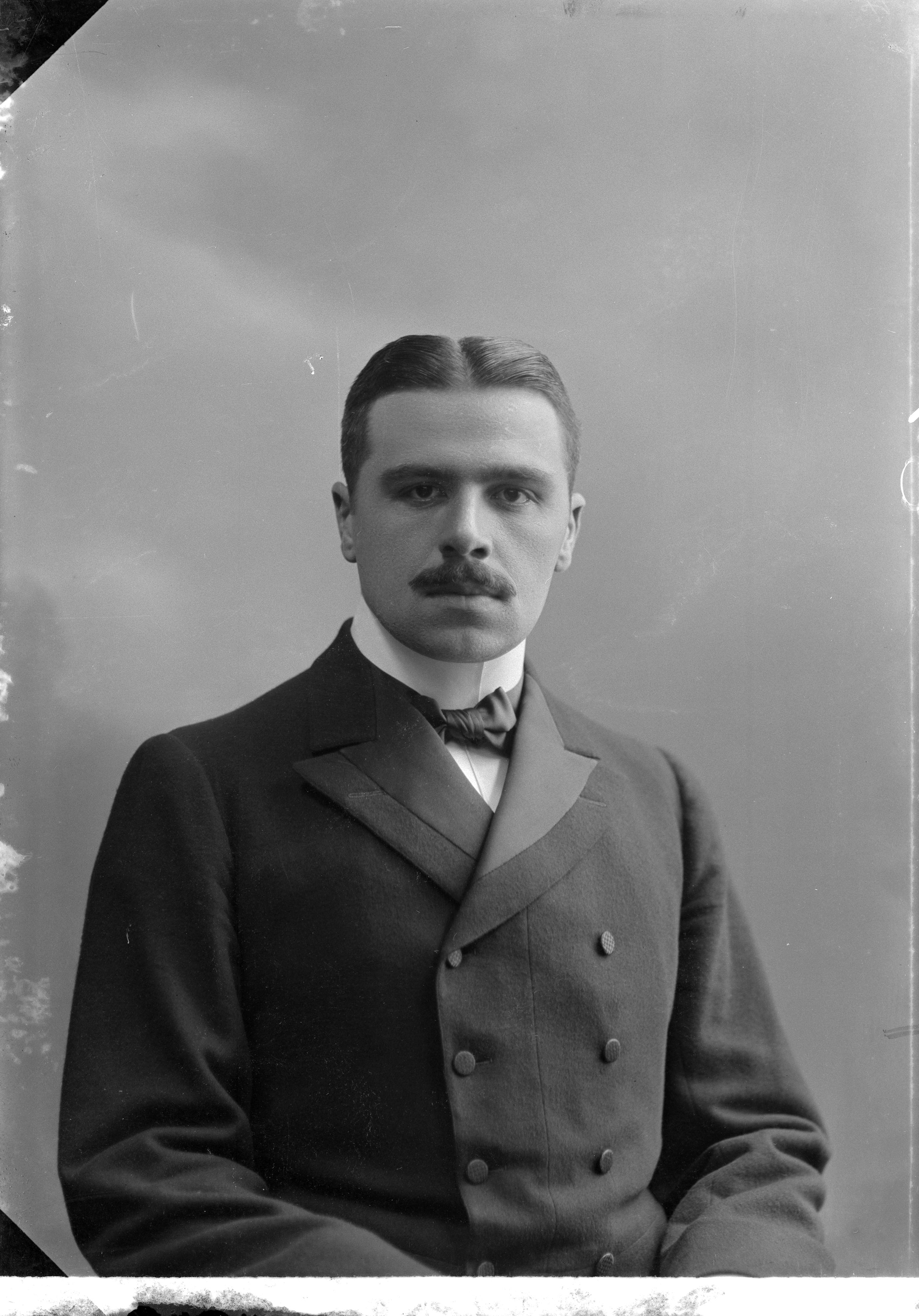 Beskrivning: Porträtt i halvfigur av hovrättsnotarie Sigurd Magnus Nyrén.