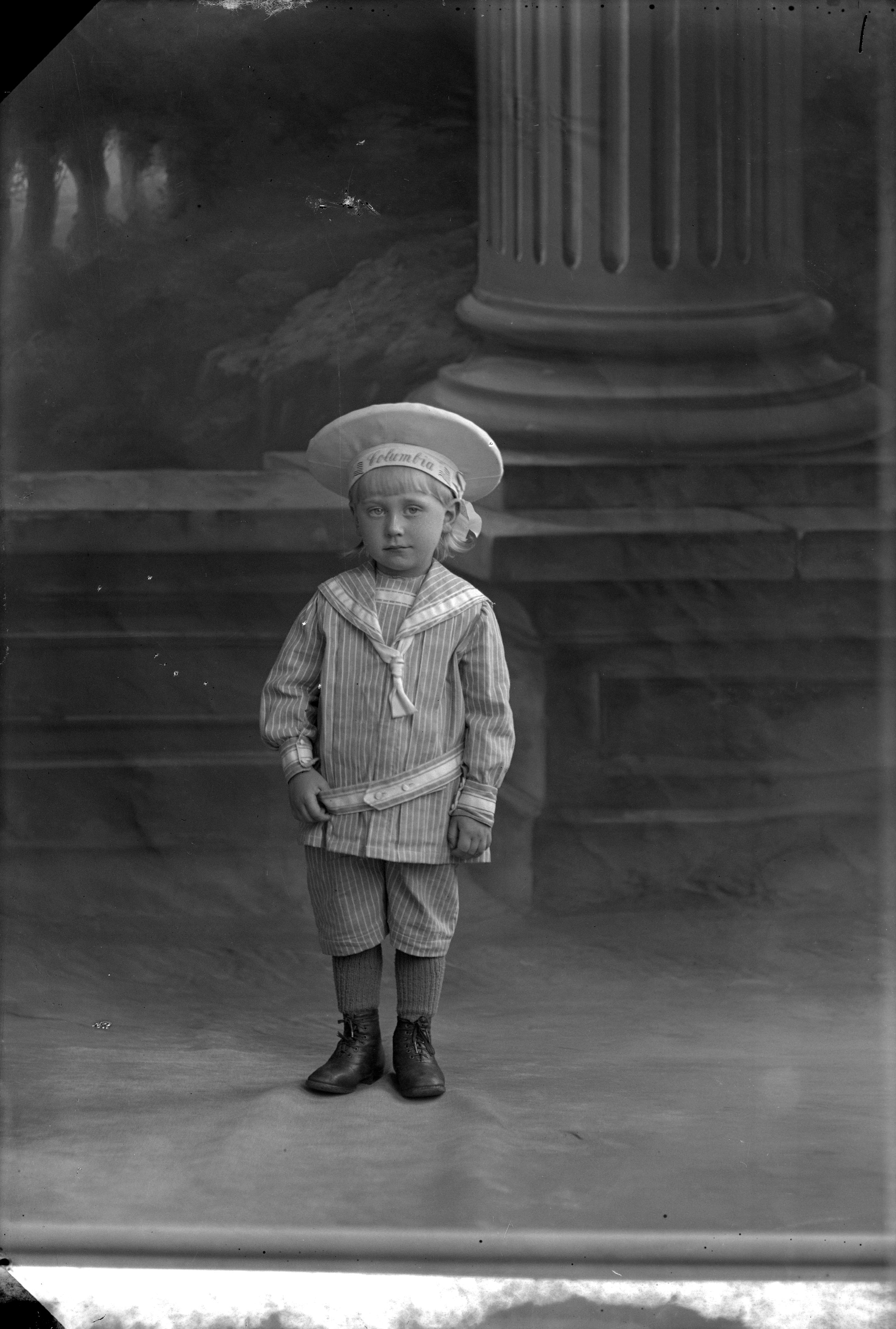 Porträtt i Hilma Kristenssons son i sjömanskostym och -mössa, stående invid ateljéfond med pelarmotiv.