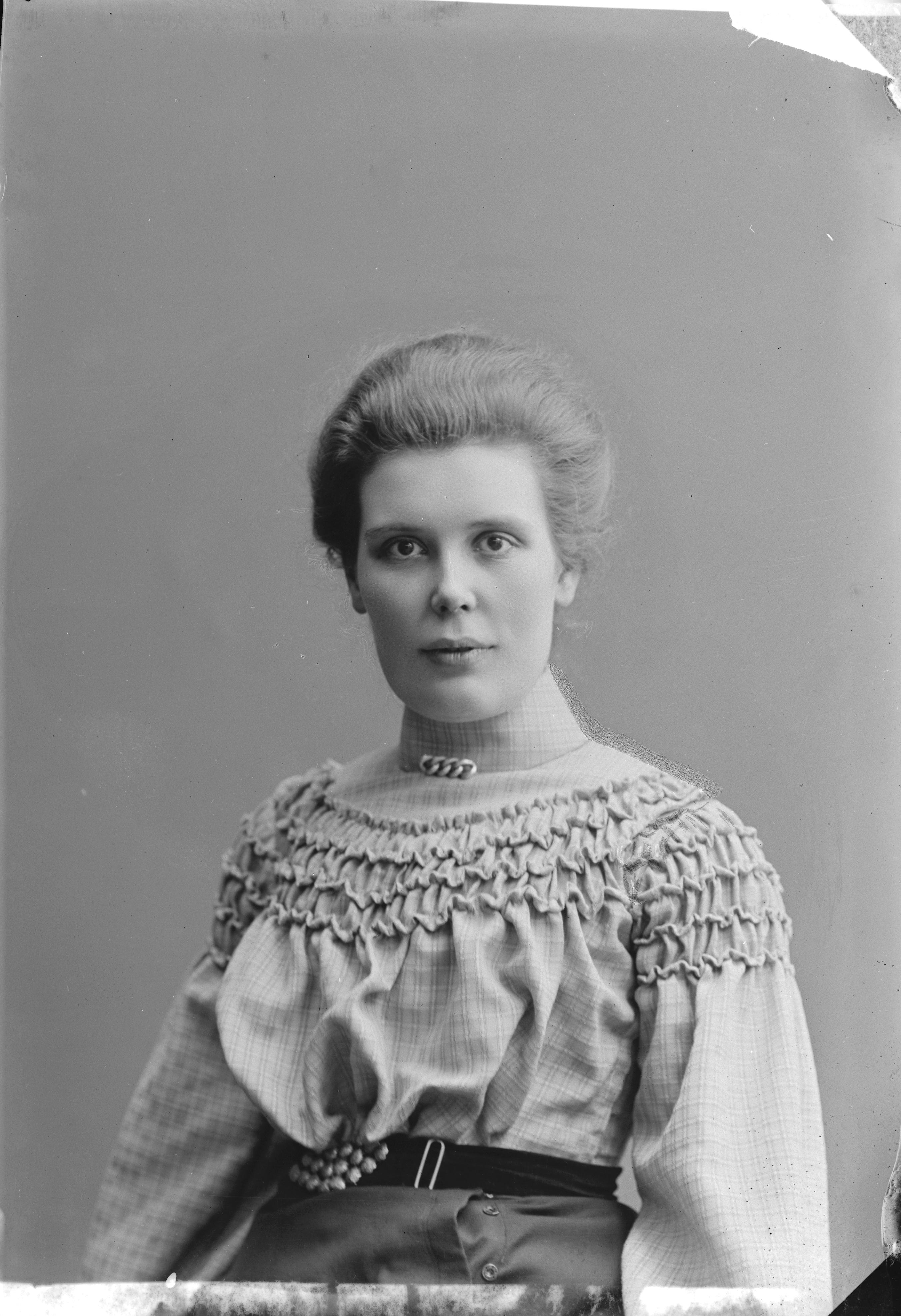 Beskrivning: Porträtt i halvfigur av fröken Kjellgren.