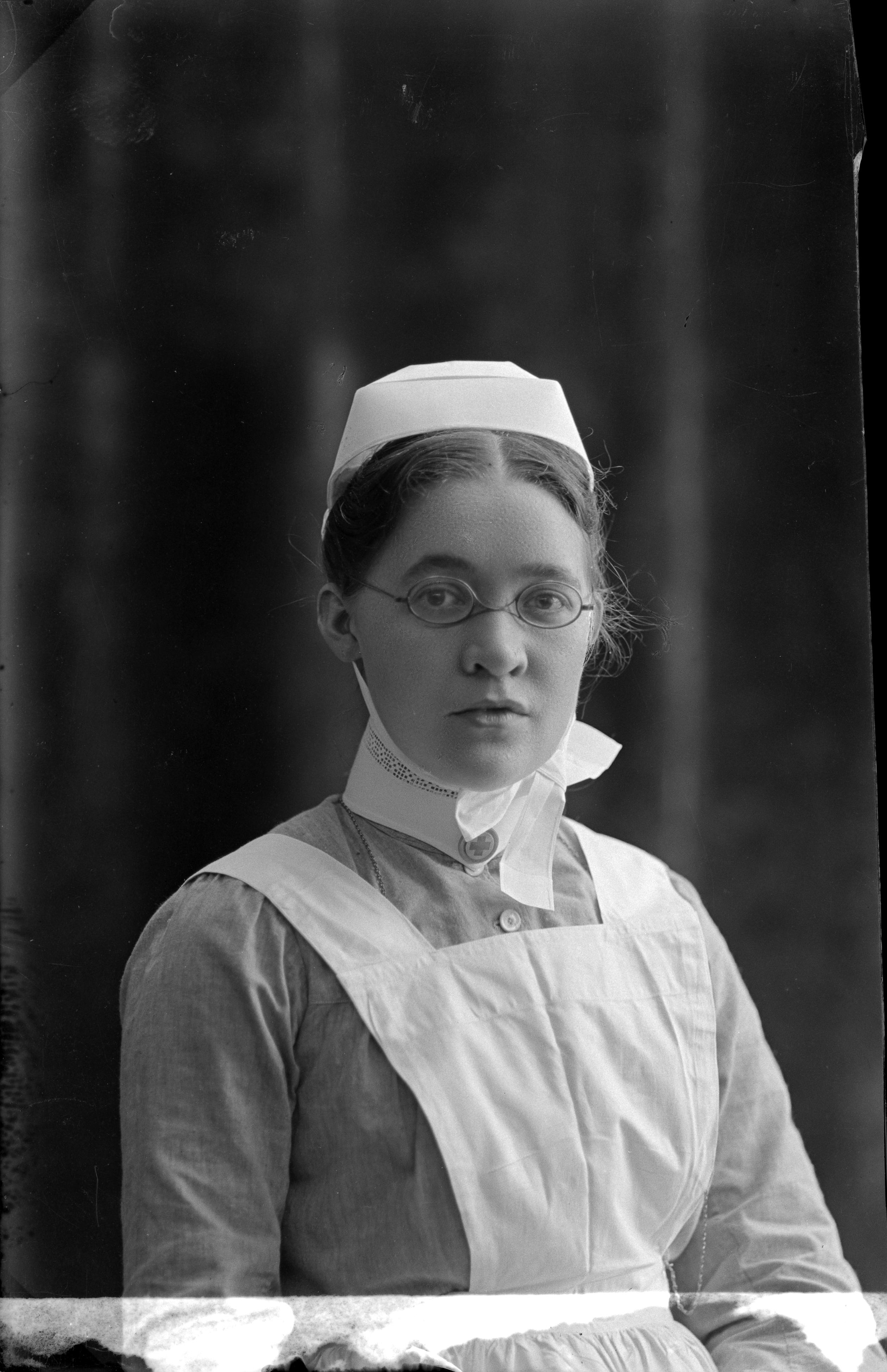 Porträtt i halvfigur av syster Nathalia i sjuksköterskeuniform.