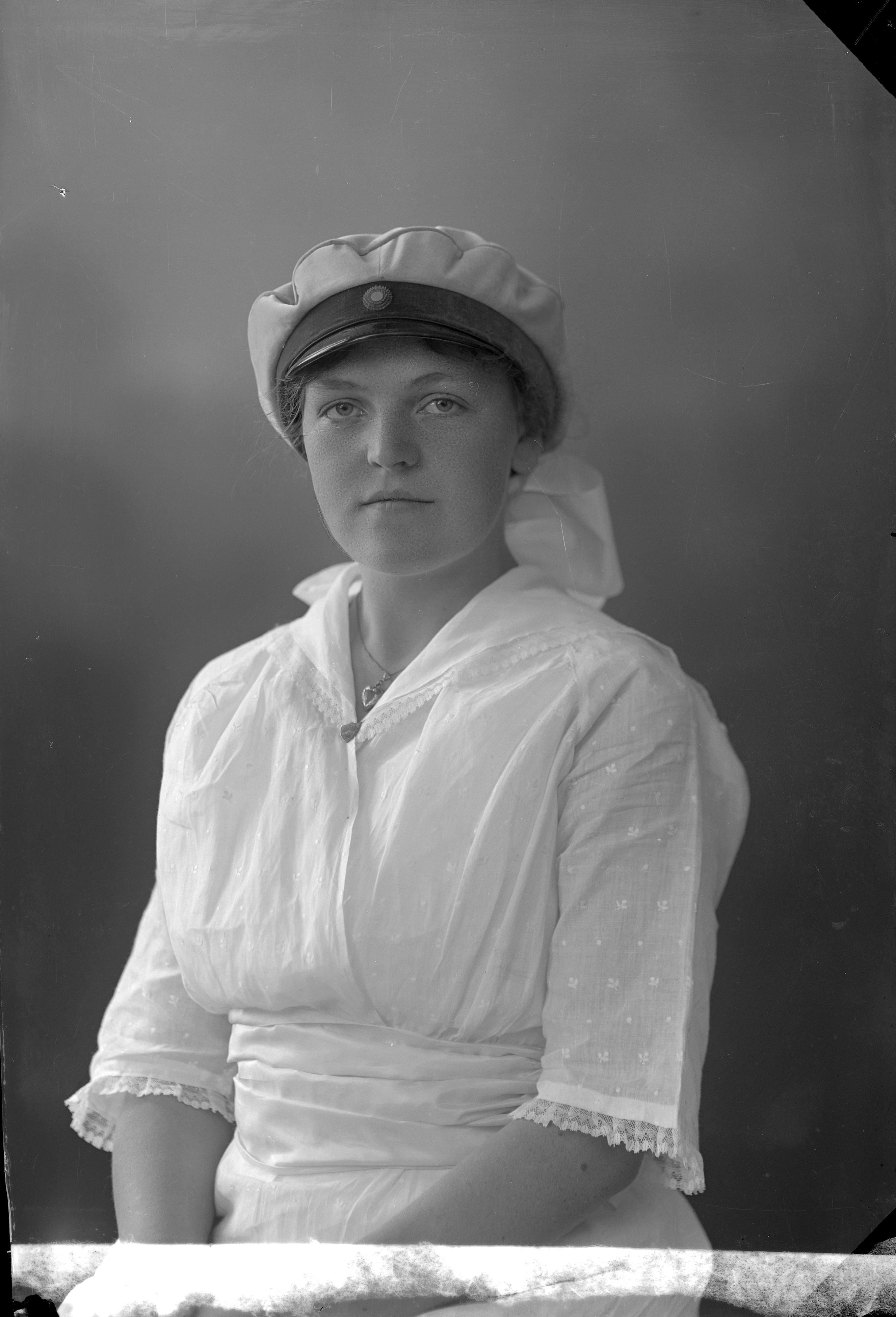 Beskrivning: Porträtt i halvfigur av Hildur Gustafsson i studentmössa.