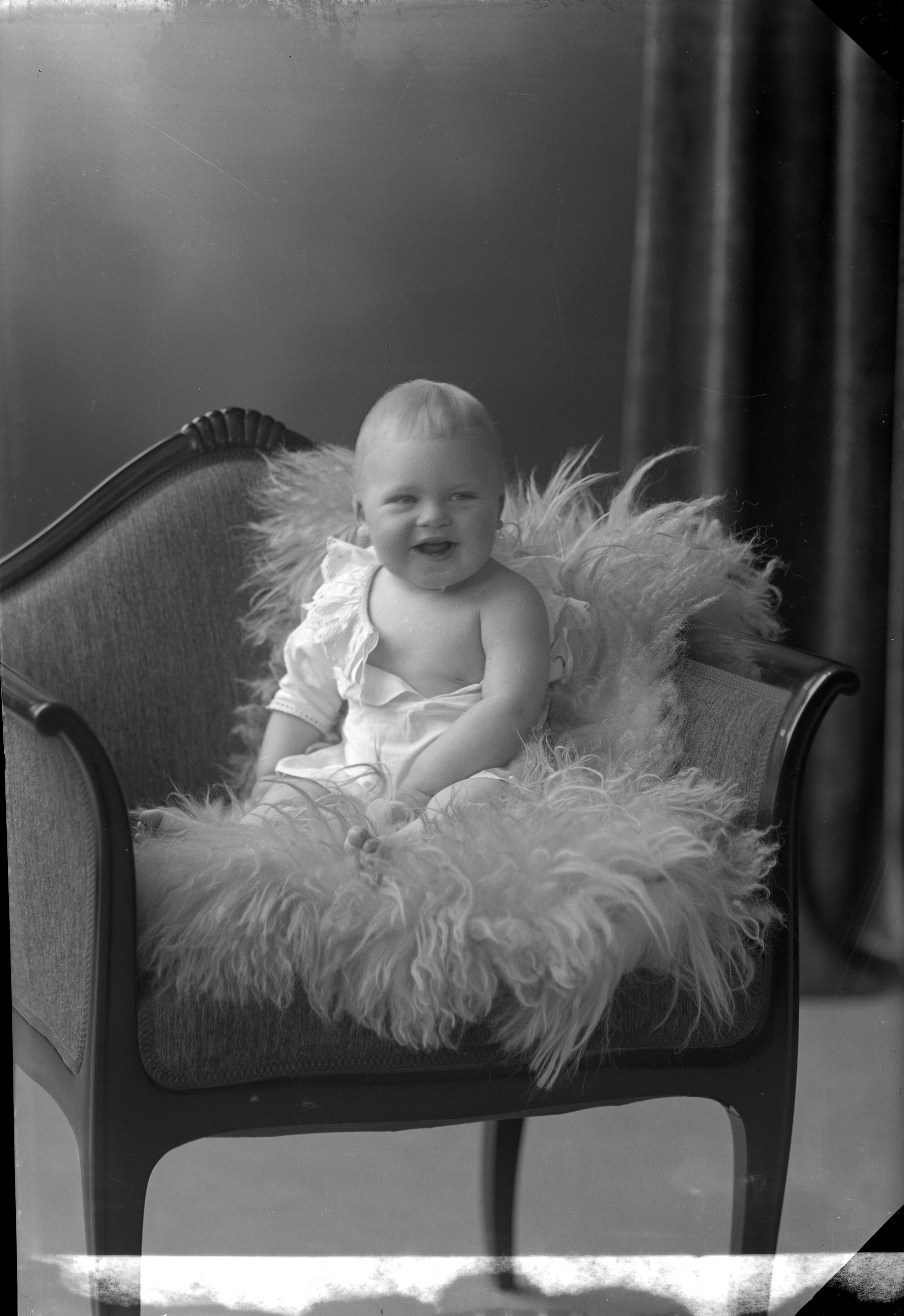 Porträtt i helfigur av Svanbergs barn sittande på fäll, lagd på stol.