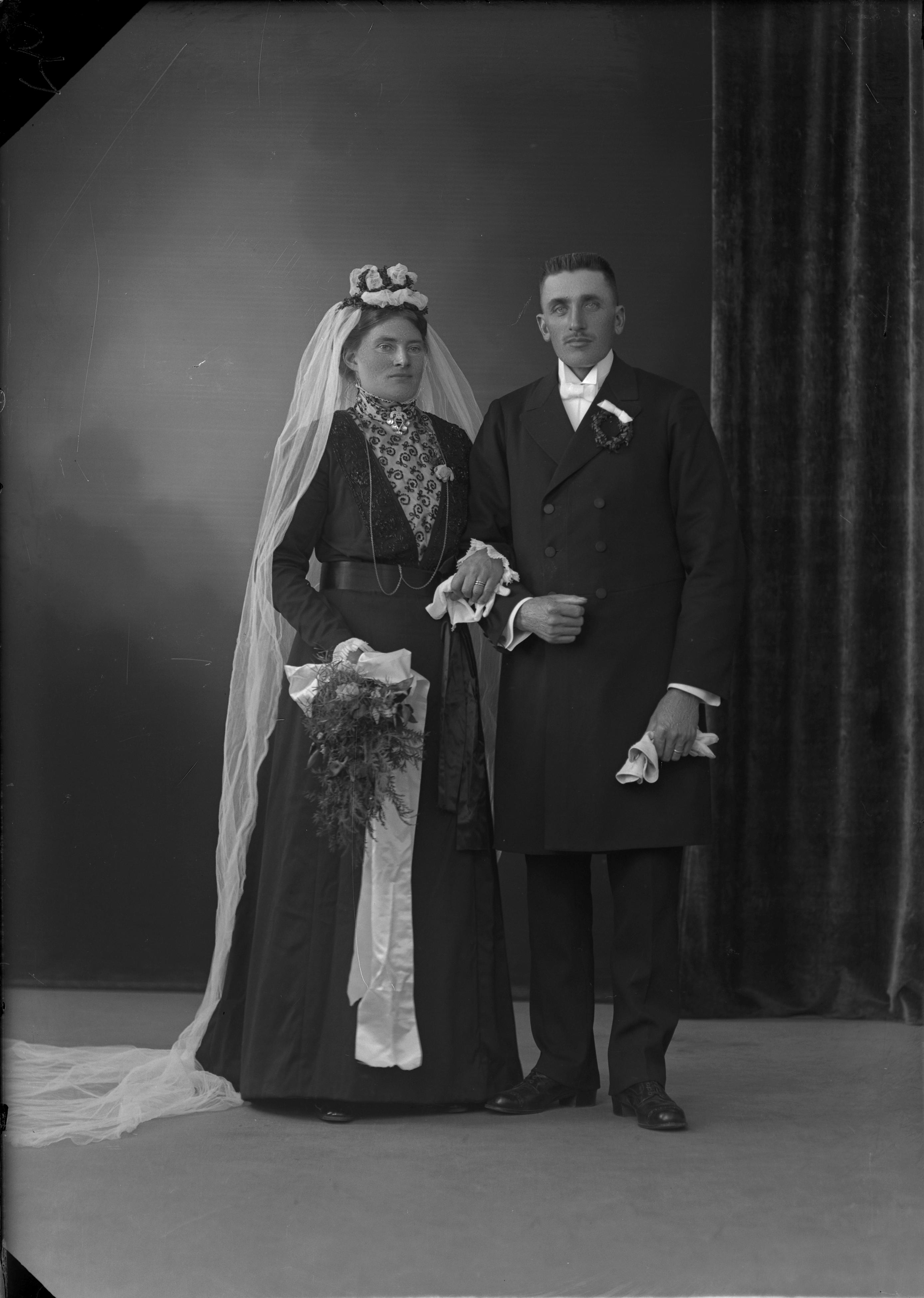 Porträtt i helfigur av J. B. Carlsson med brud.