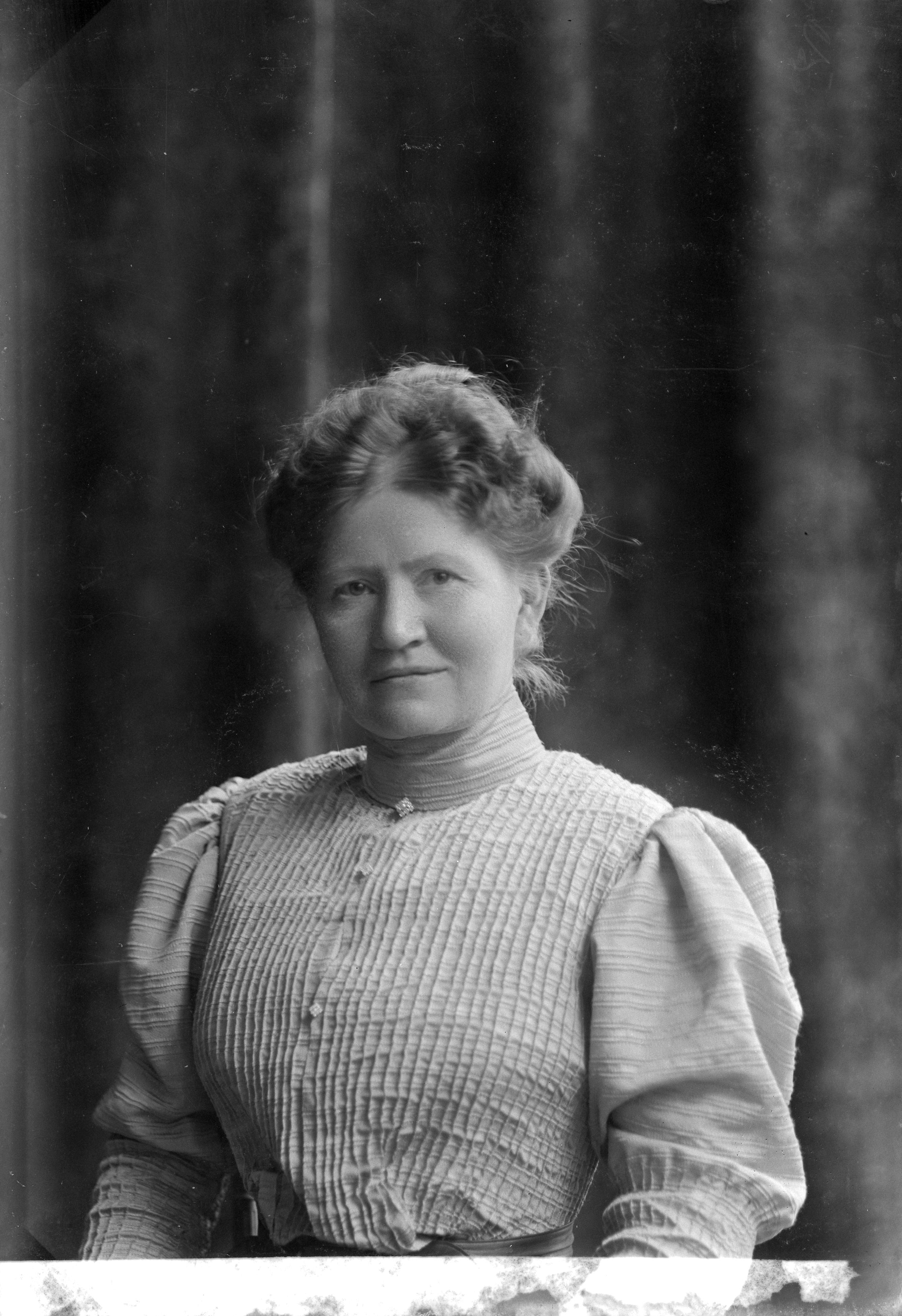 Beskrivning: Porträtt i halvfigur av Augusta Andersson.
