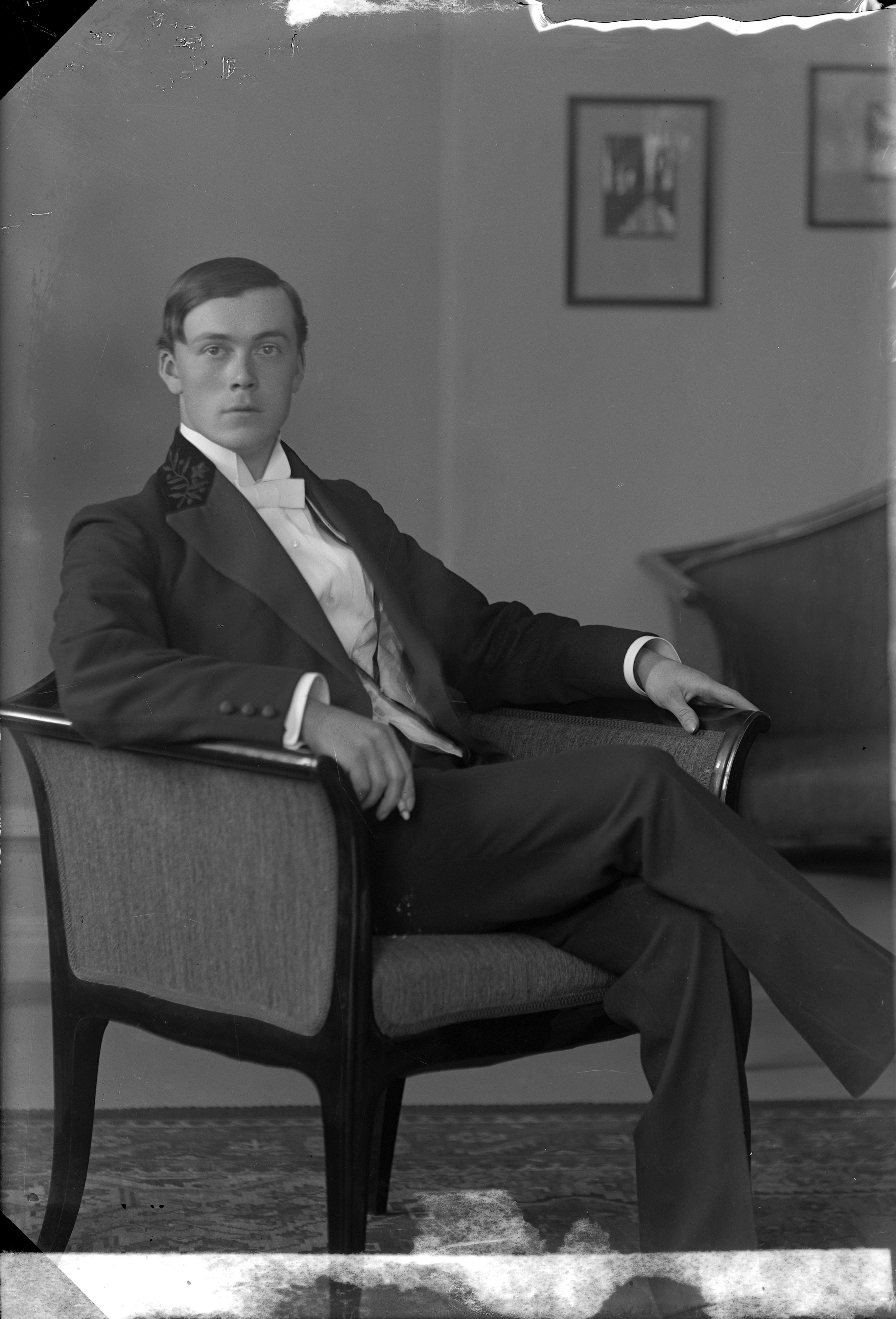 Beskrivning: Porträtt i helfigur av kandidat Hugo Witzell sittande i stol.