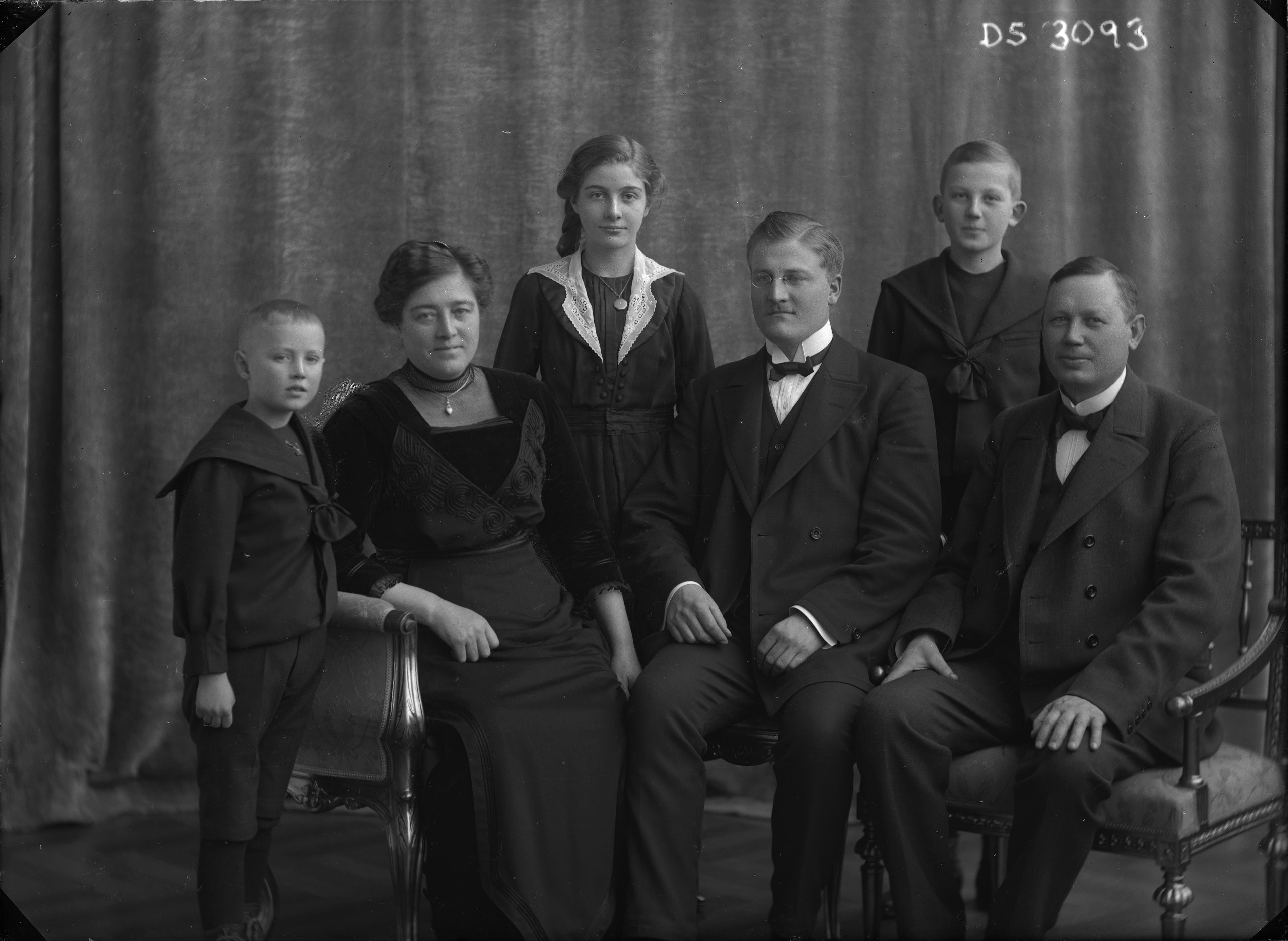 Porträtt av veterinär Magnus Nilsson Linde med familj, frun Kersti och barnen Gulli, Erik och Karl-Martin.