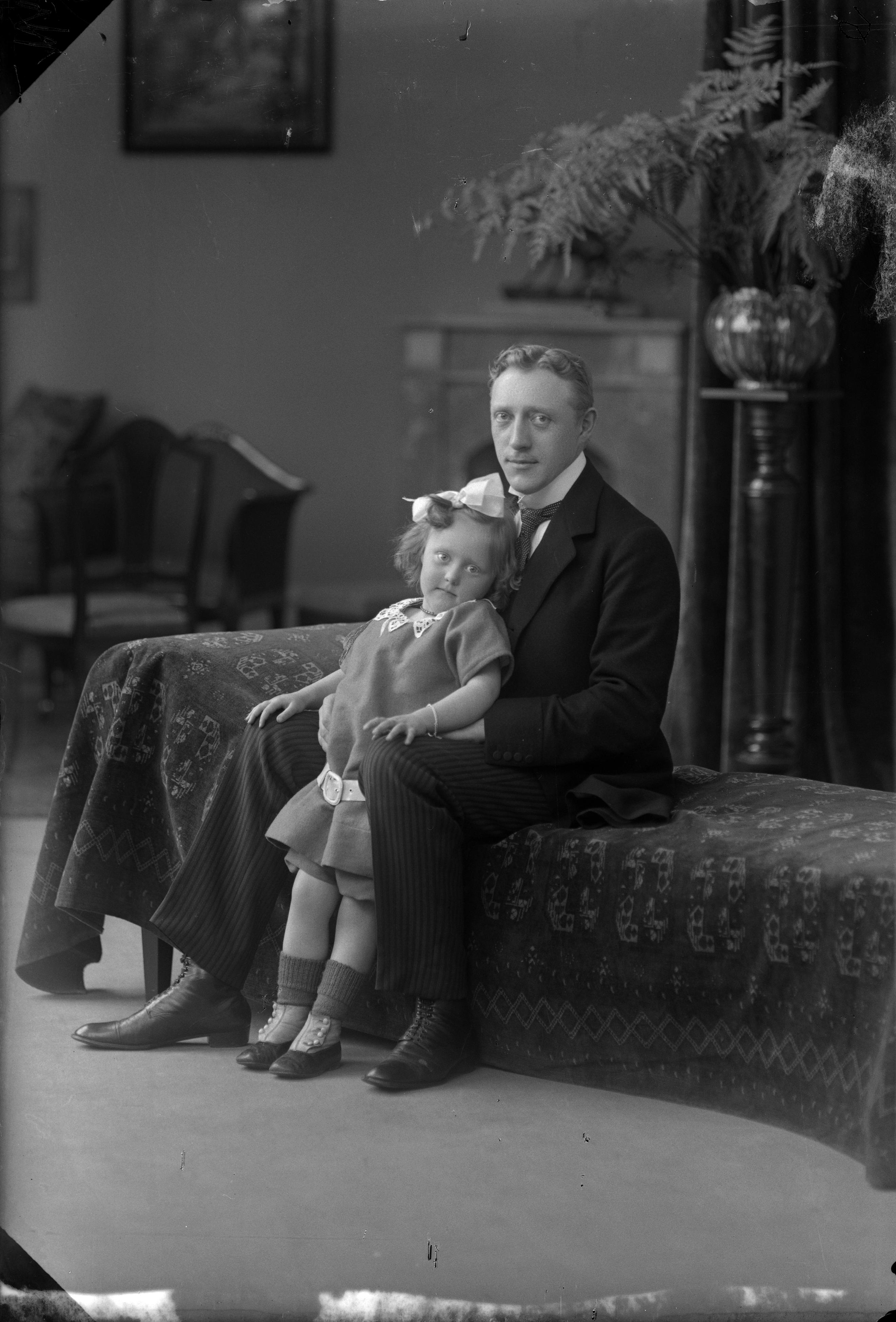 Porträtt i halvfigur av Fougn Poulsen med dotter i rumsinteriör.