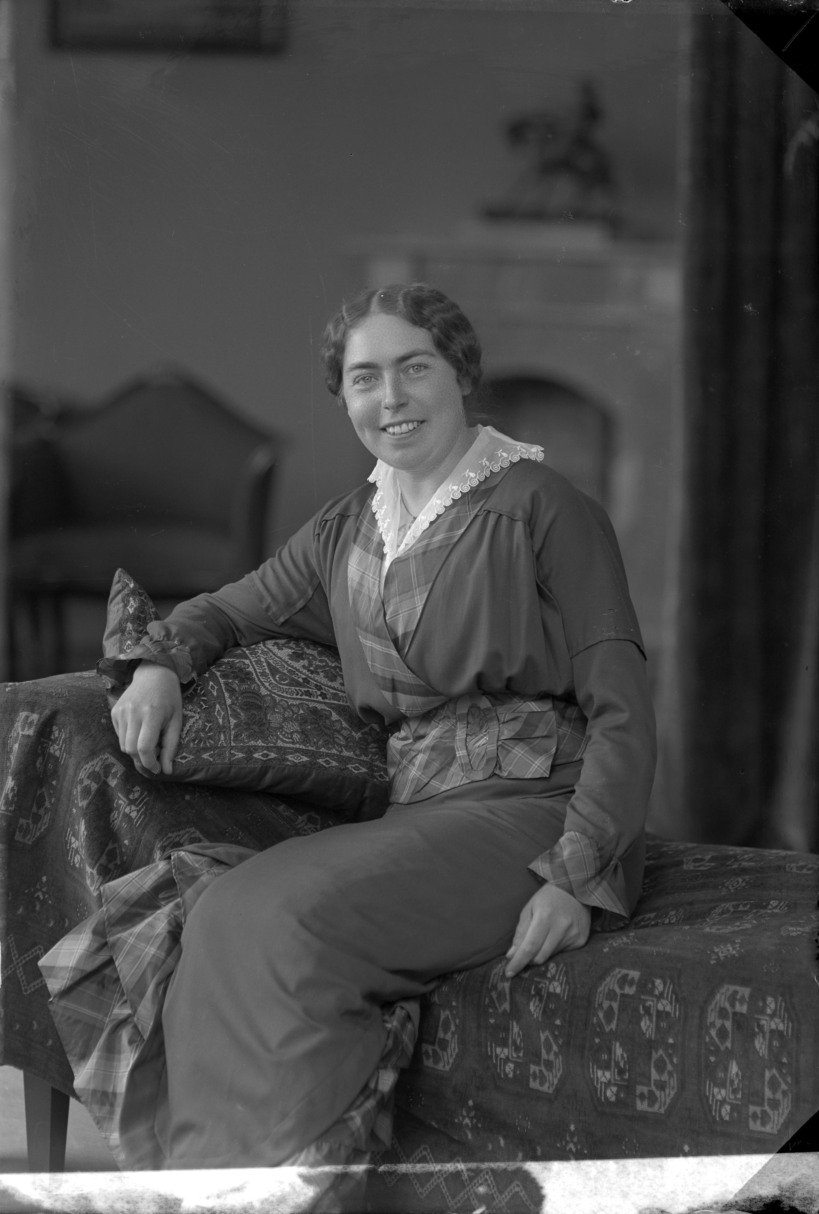 Porträtt i helfigur av Frida Svensson, sittande på soffa.