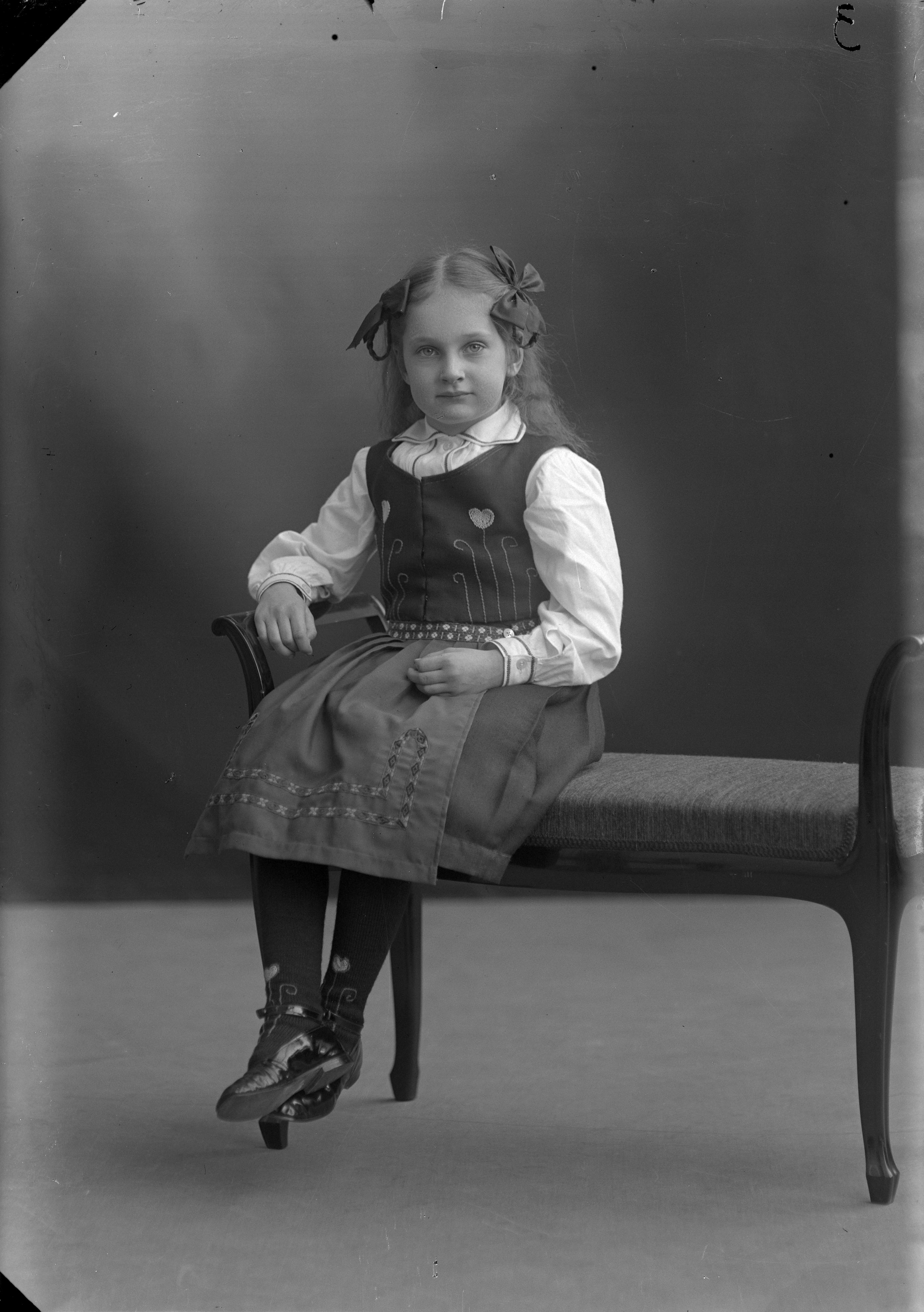 Porträtt i helfigur av Hansson dotter, sittande på pall.