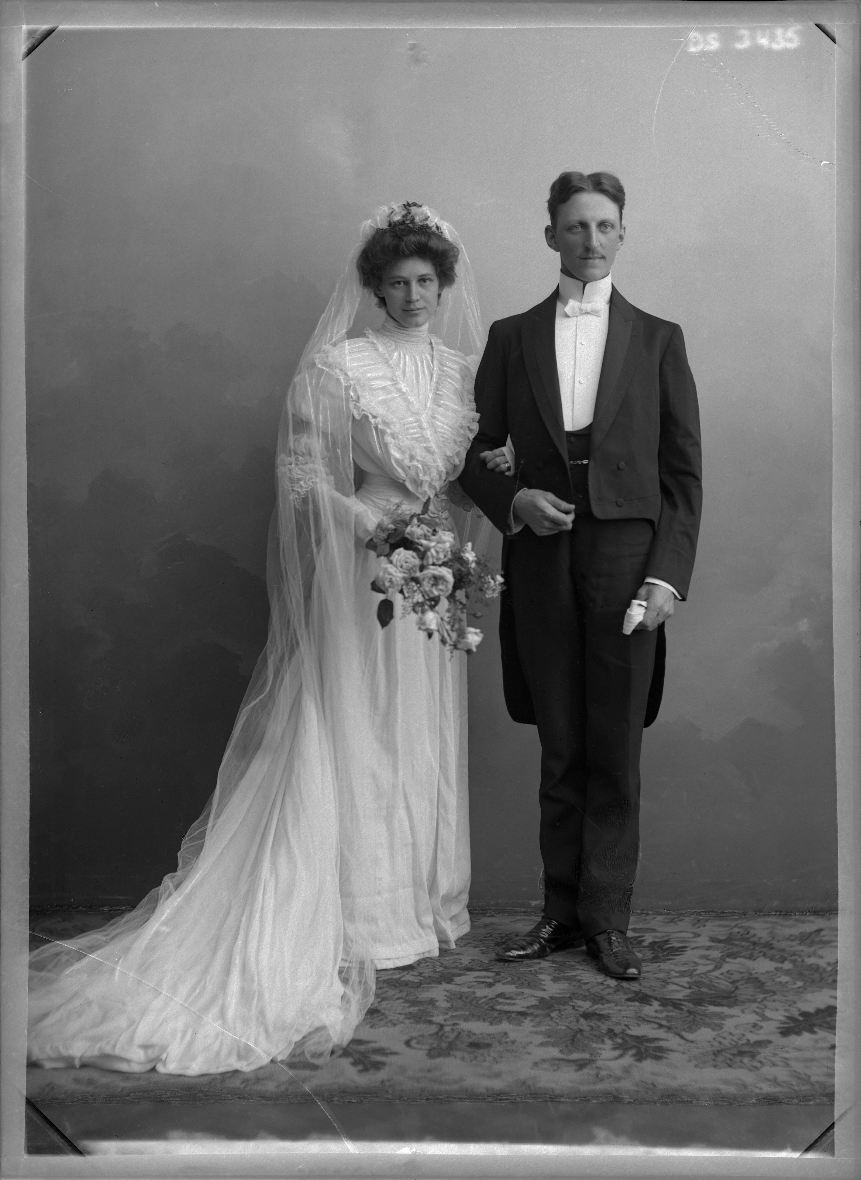 Porträtt i helfigur av Julius Beijer med sin brud Karin, född Ström.