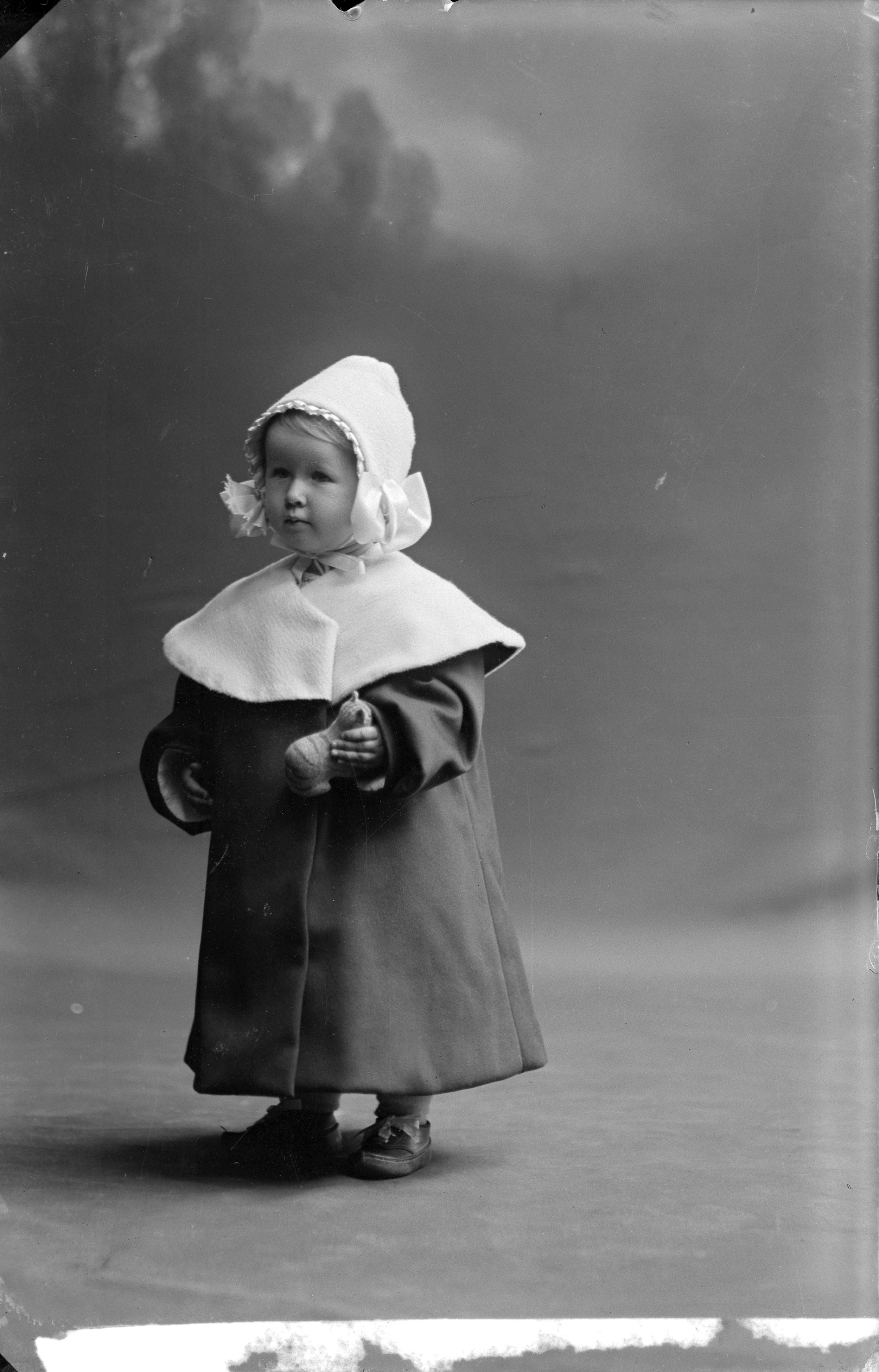 Porträtt i helfigur av Sandgrens dotter i hätta och ytterkläder. Hon håller en leksakskatt. Ateljéfond utgör bakgrunden.