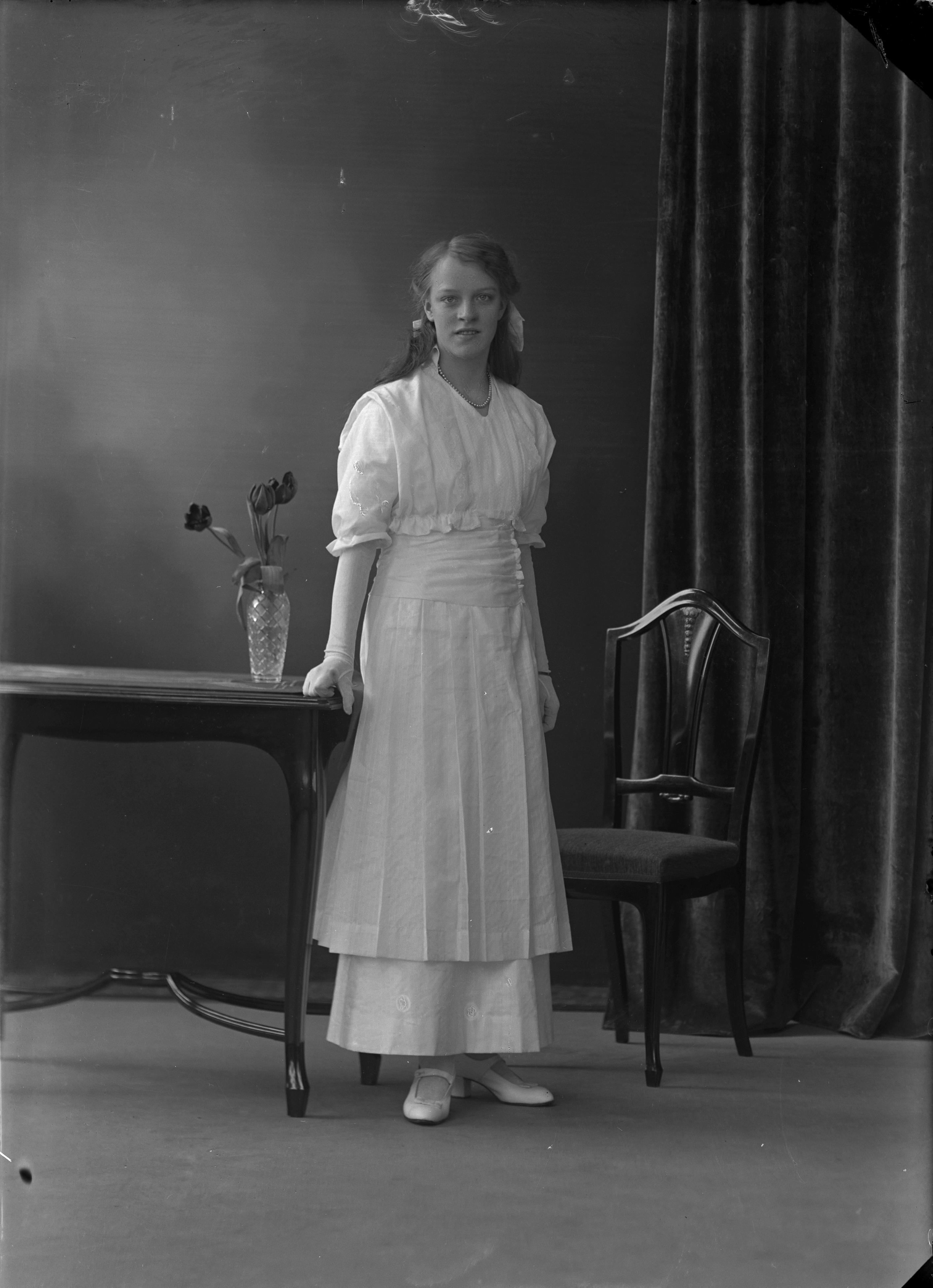 Porträtt i helfigur av Ellen Svanberg, stående vid bord.