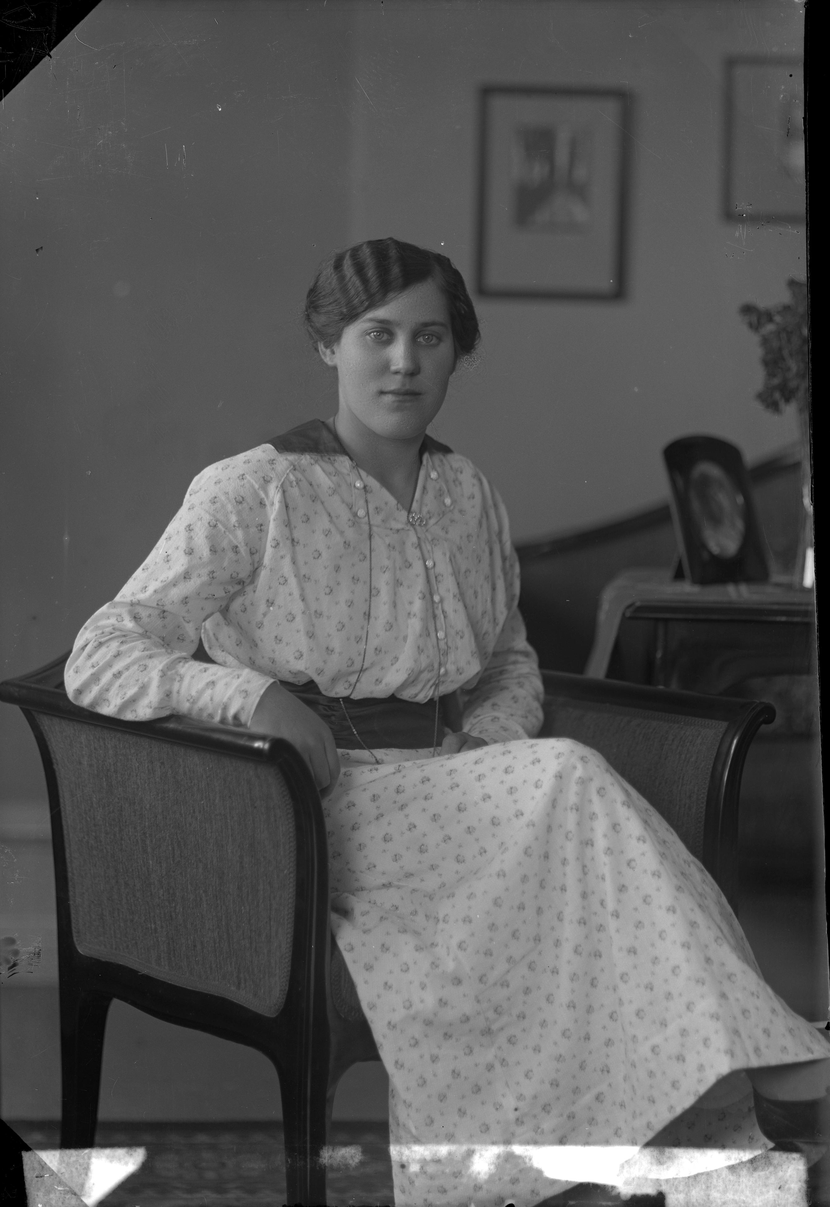 Porträtt i helfigur av fröken Gullberg sittande i rumsinteriör.