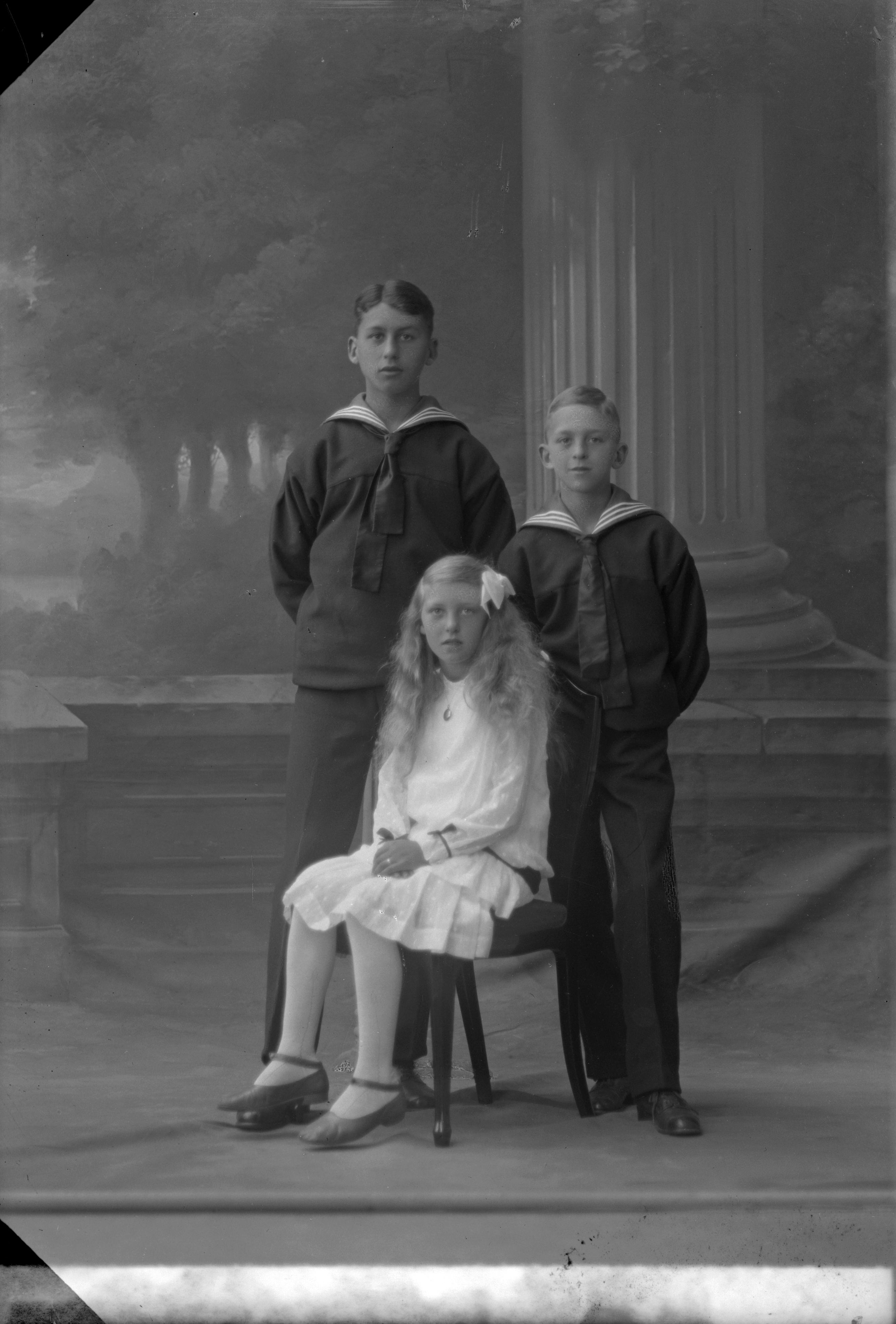 Porträtt i helfigur av Perssons två söner och dotter. Sönerna i sjömanskostymer, dottern sittande. Fotograferade framför ateljéfond med pelarmotiv.