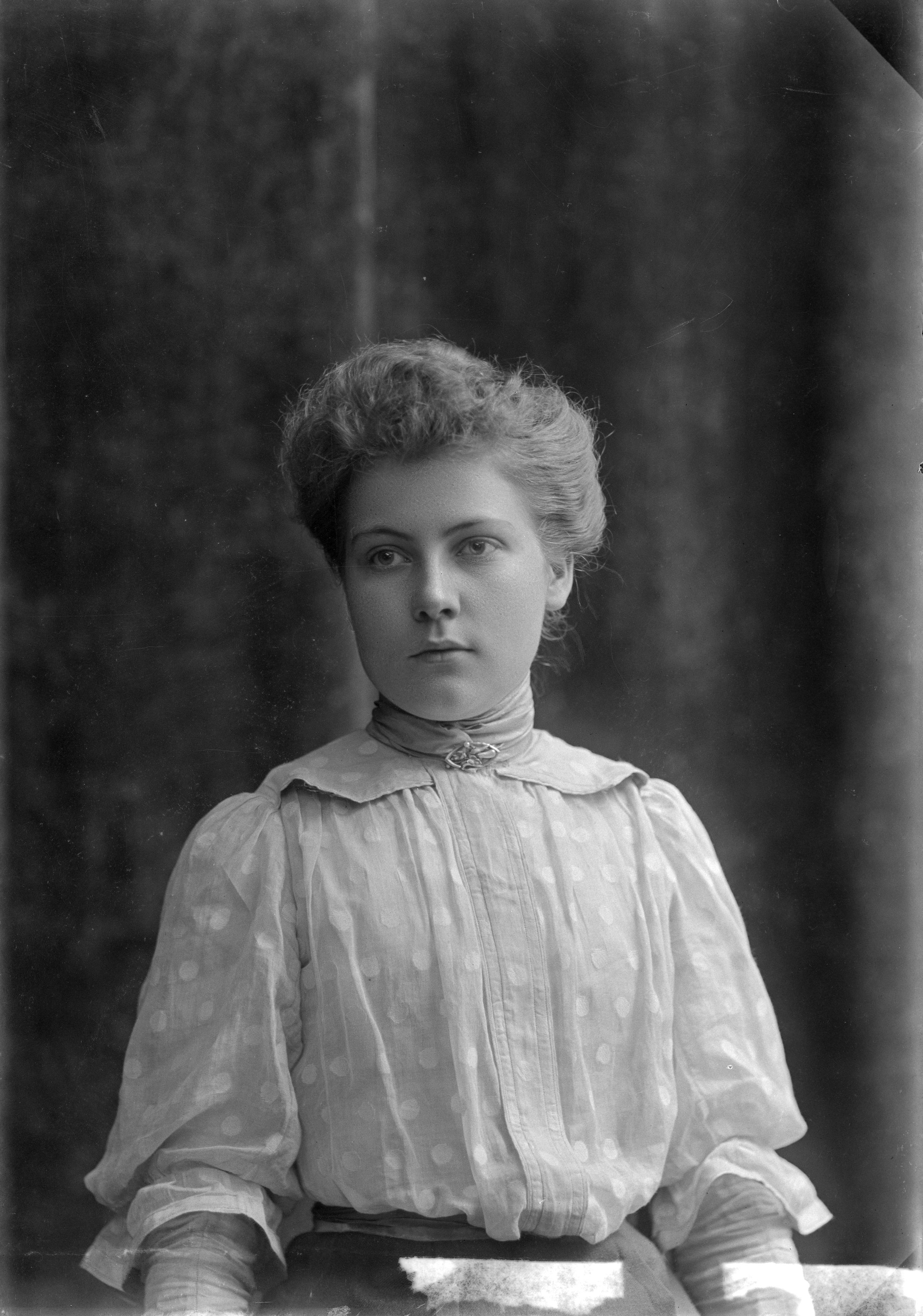 Beskrivning: Porträtt i halvfigur av fröken Norrman.