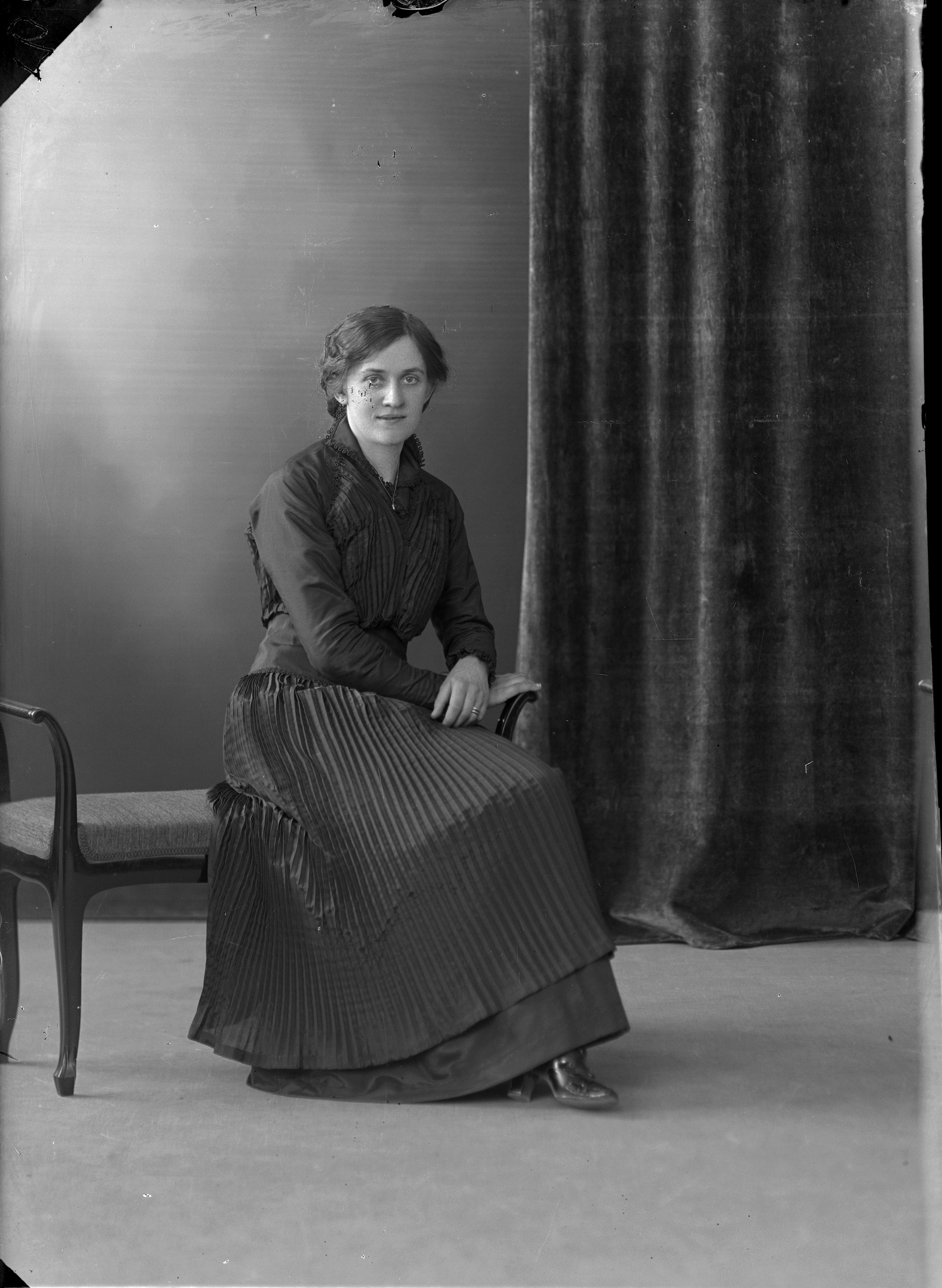 Porträtt i helfigur av fru Larsson, sittande på en bred pall.
