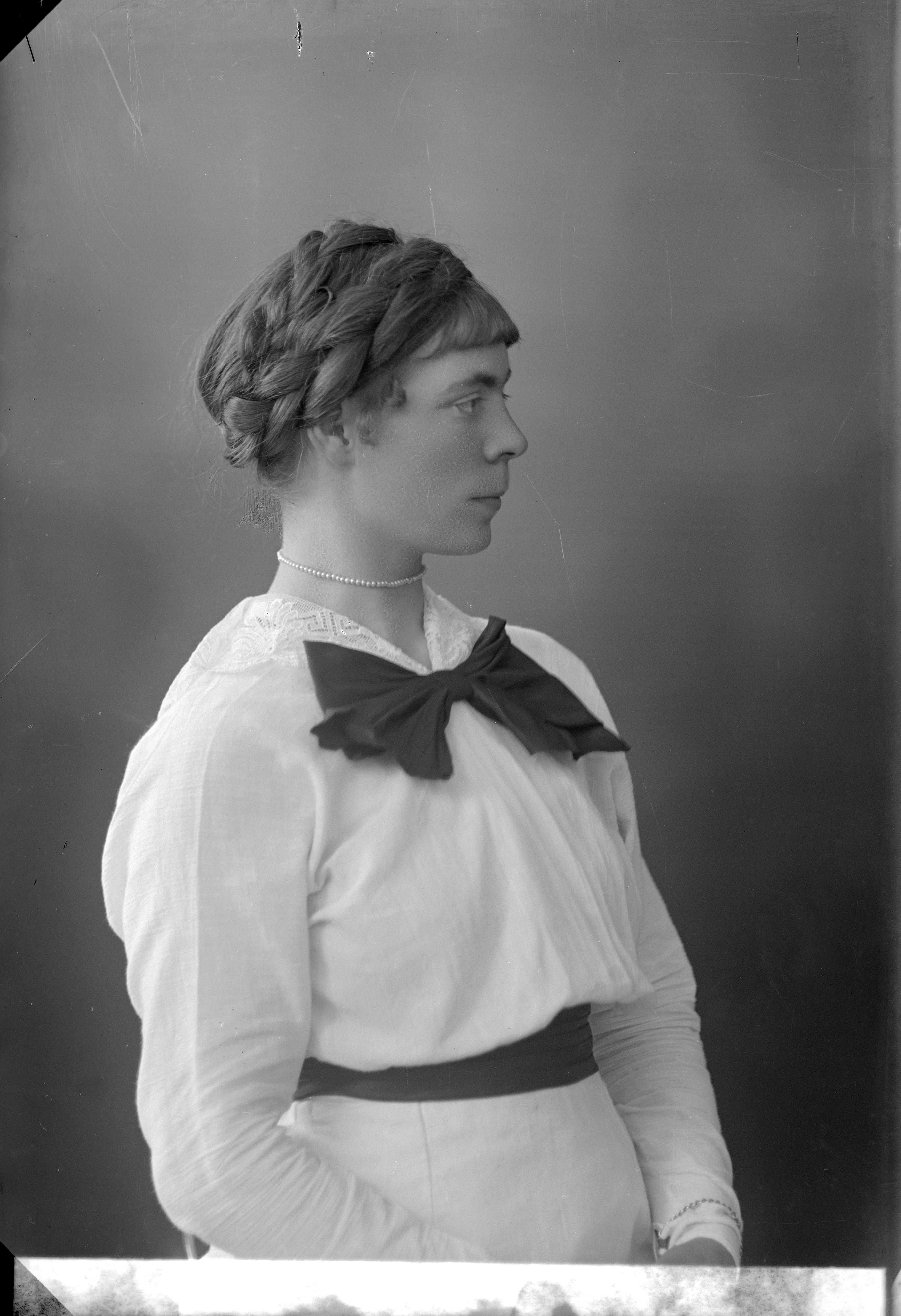 Beskrivning: Porträtt i halvfigur av Dagny Andersson med stor rosett vid bluskragen.