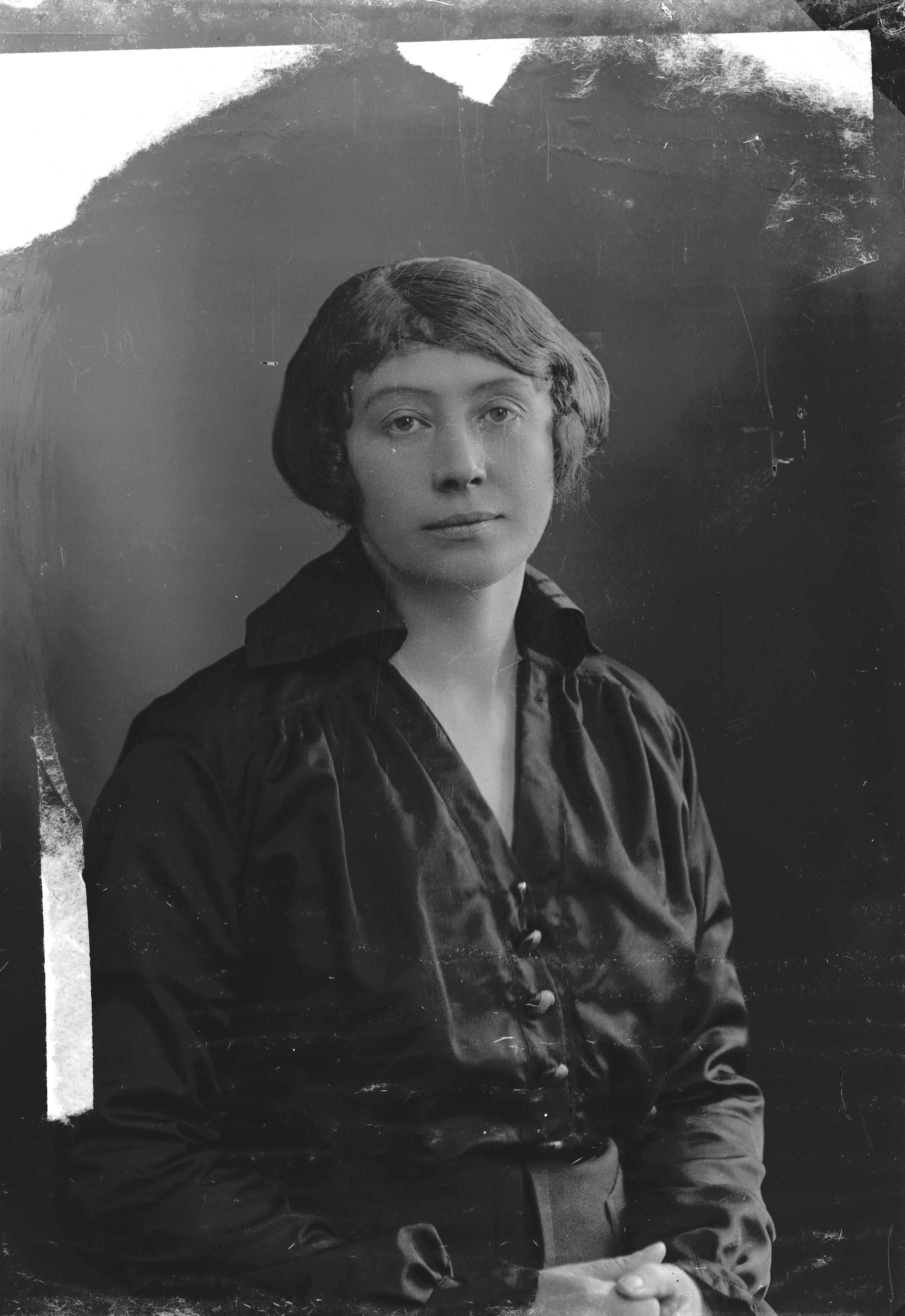 Beskrivning: Porträtt i halvfigur av Maja Lundholm.