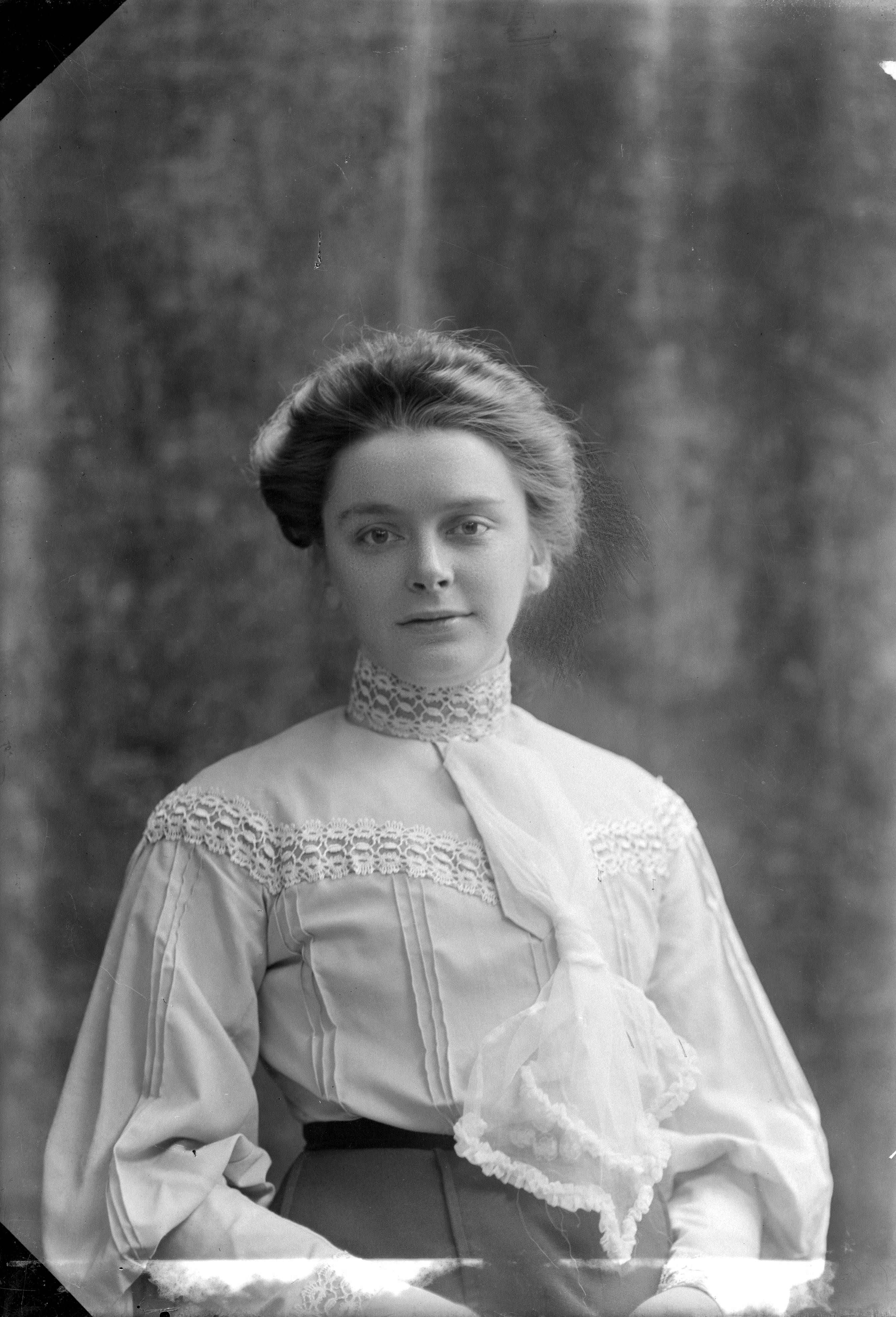 Beskrivning: Porträtt i halvfigur av fröken Olander.