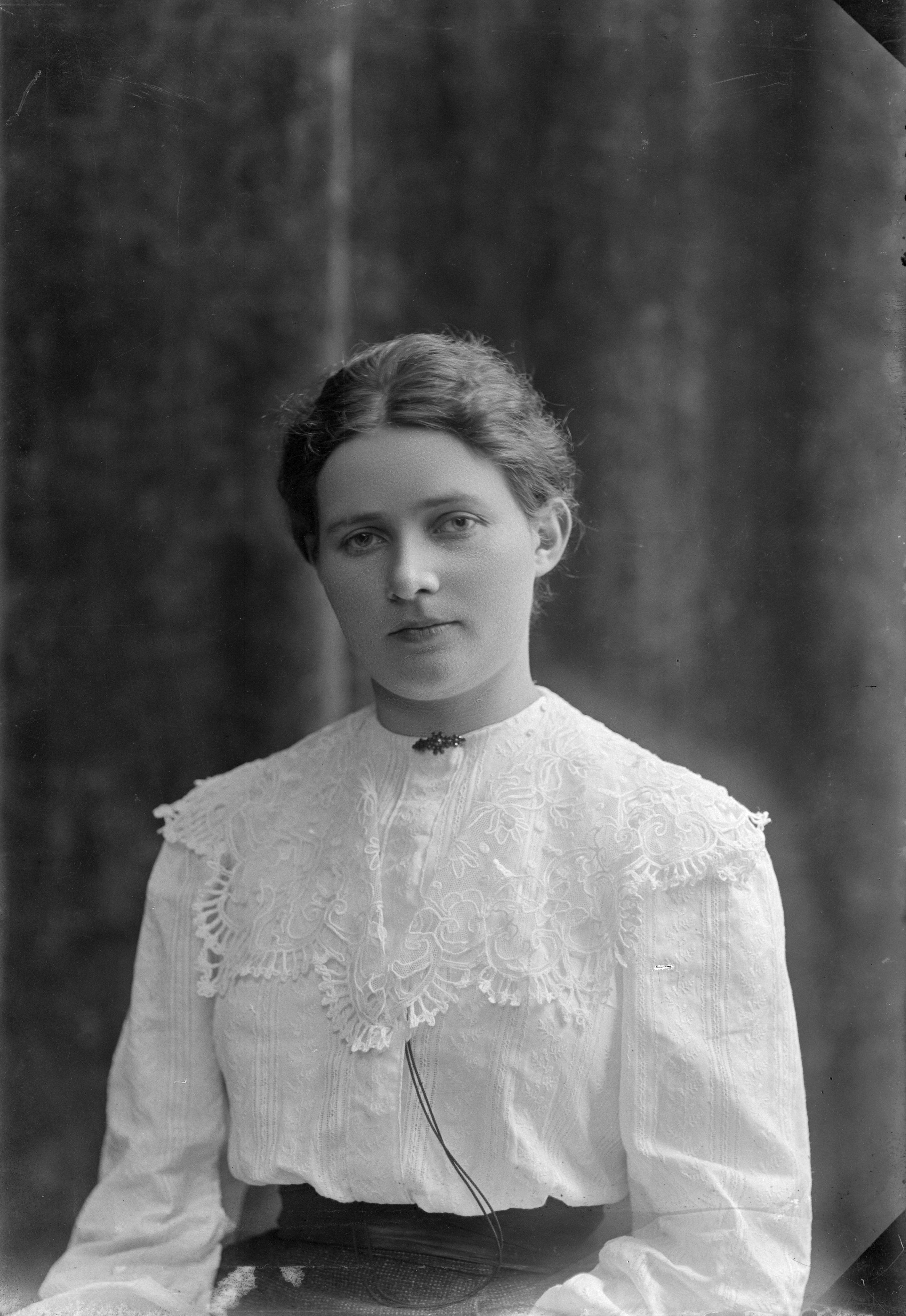 Beskrivning: Porträtt i halvfigur av Ester Malmberg.