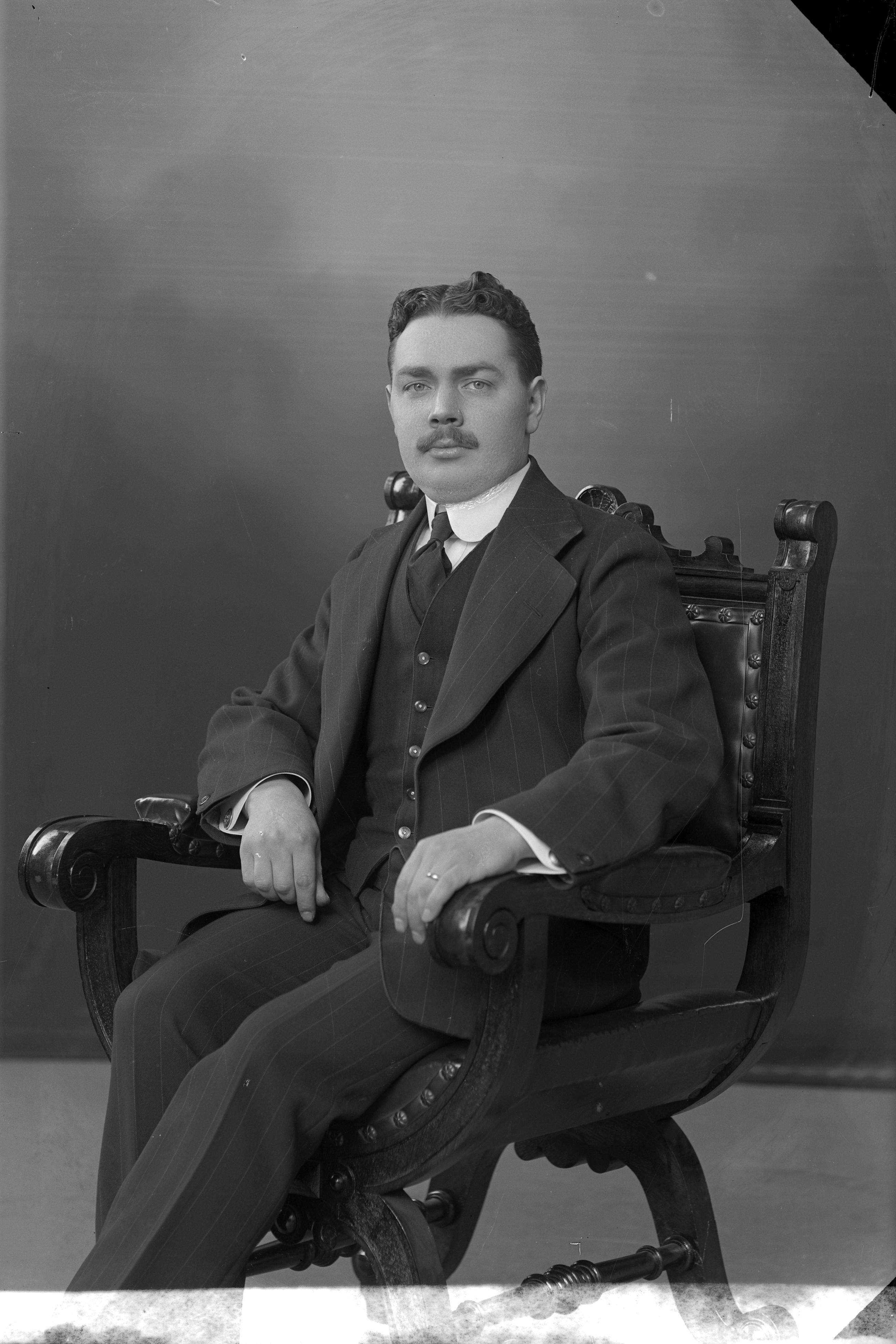 Porträtt i helfigur av skoarbetare Herman Östmark, sittande i stol.