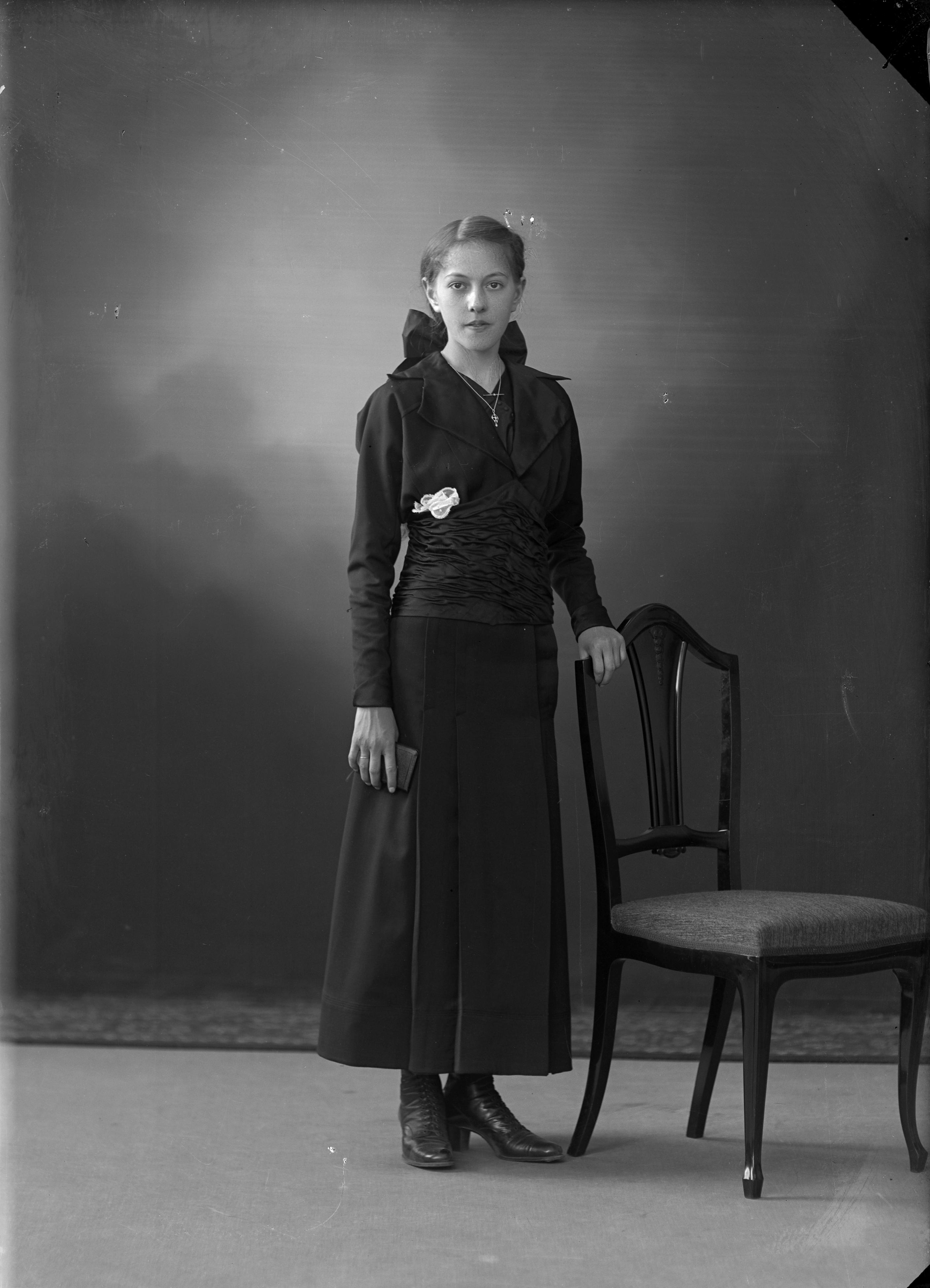 Porträtt i helfigur av Siri Holmqvist, stående vid stol. Hon bär en stor rosett i nacken.