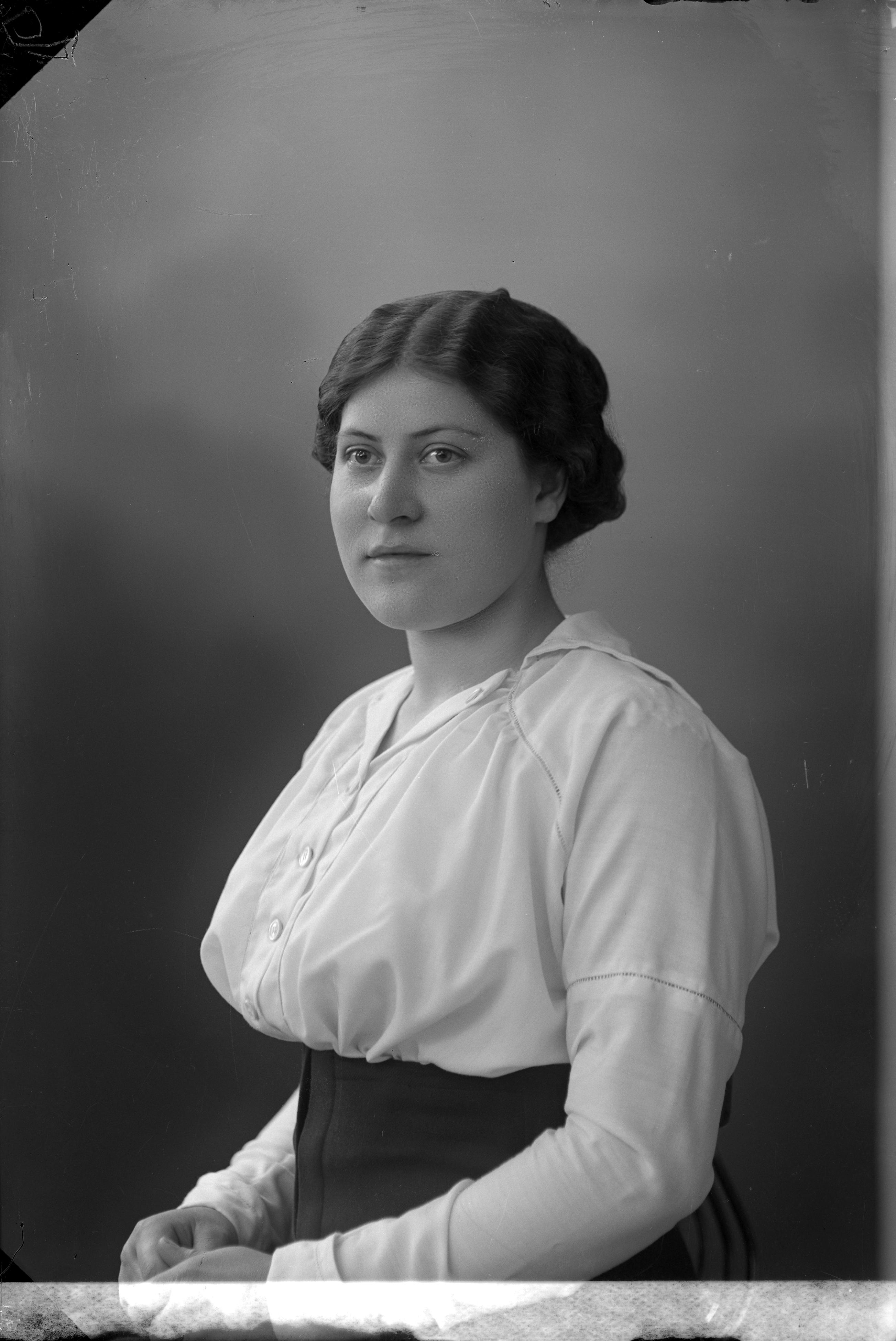 Beskrivning: Porträtt i halvfigur av fröken Brodin.