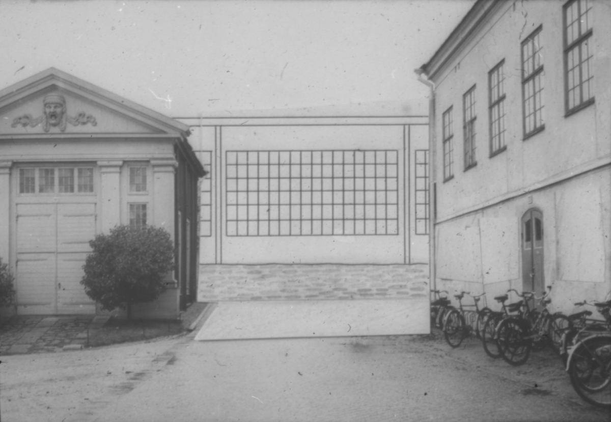 Titel: Bilden visar Bildhuggareverkstaden på örlogsvarvet i Karlskrona sett från Kansligatan.
