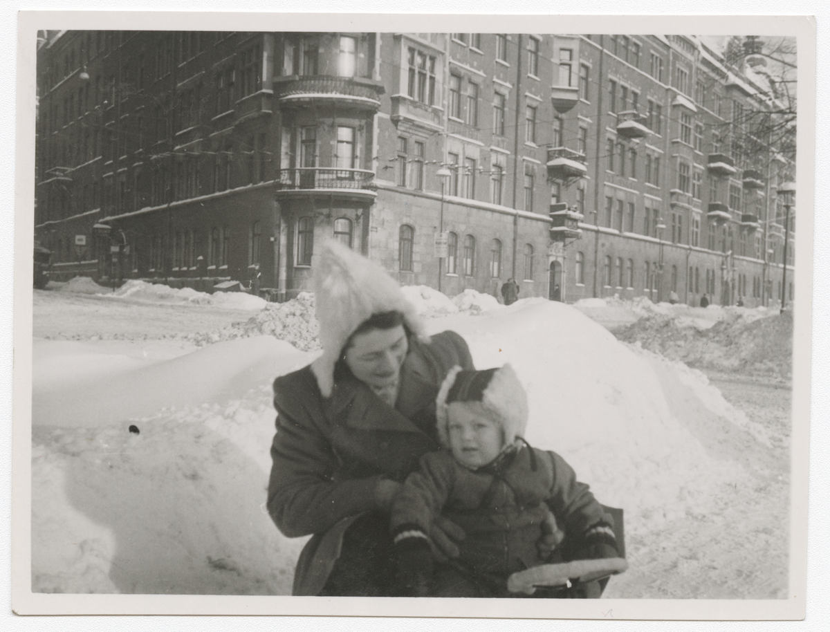 Titel: Vinter i Stockholm. En kvinna och ett barn.