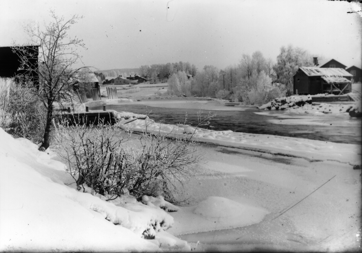 Vinterbild över Voxnan. Till höger Kvarngården, i bakgrunden bl a handlare Perssons och Ol-Ers.