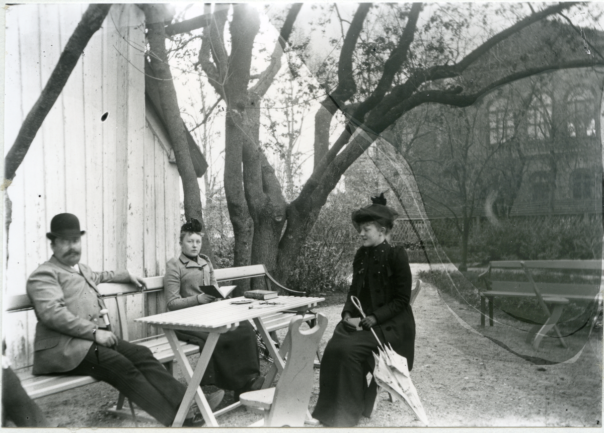 Tre personer sitter i Öjermarks trädgård. C:a 1900-1910.
