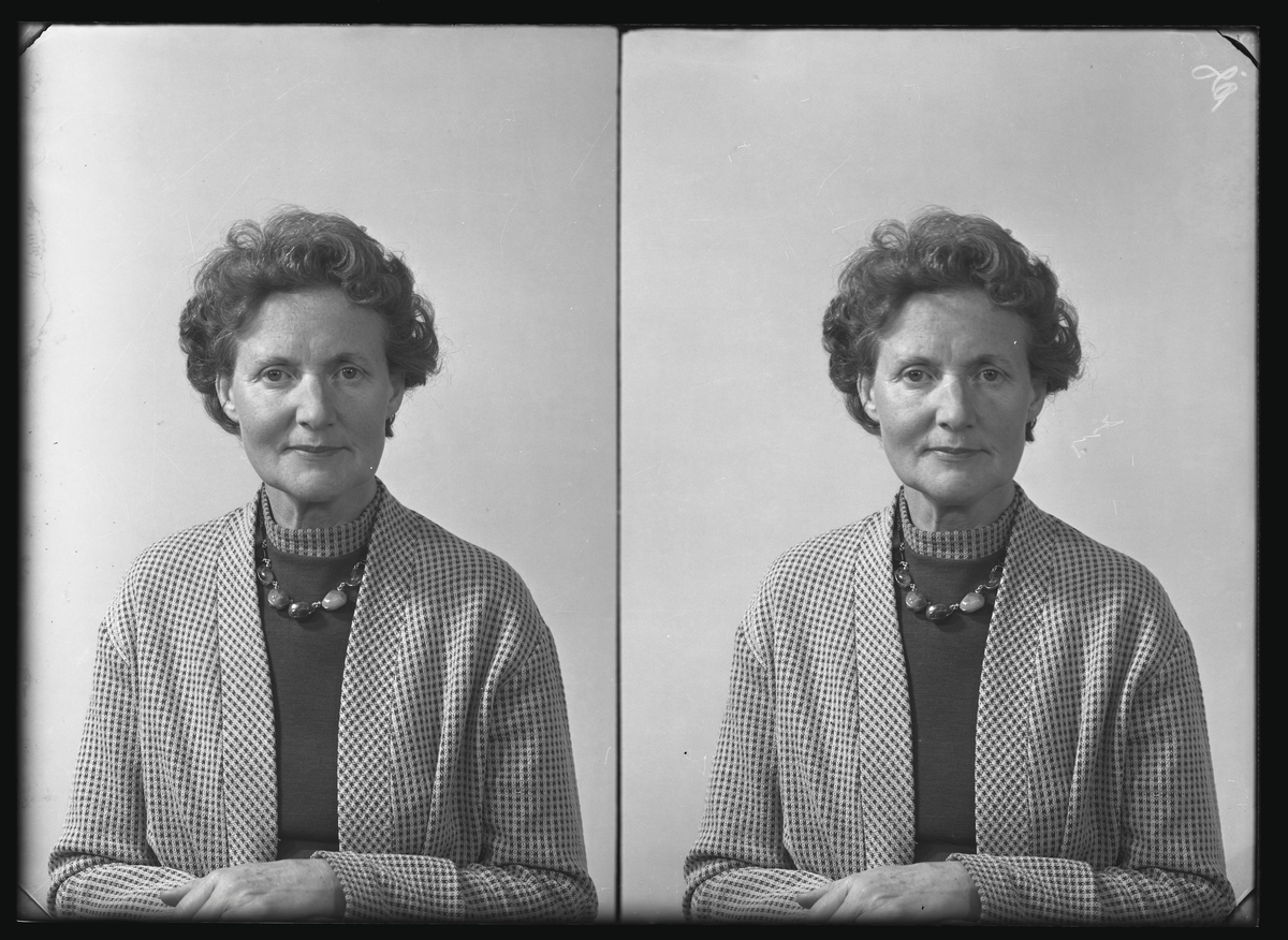 Porträtt. passfoto. Fru Eva Lundberg, Mölntorp.