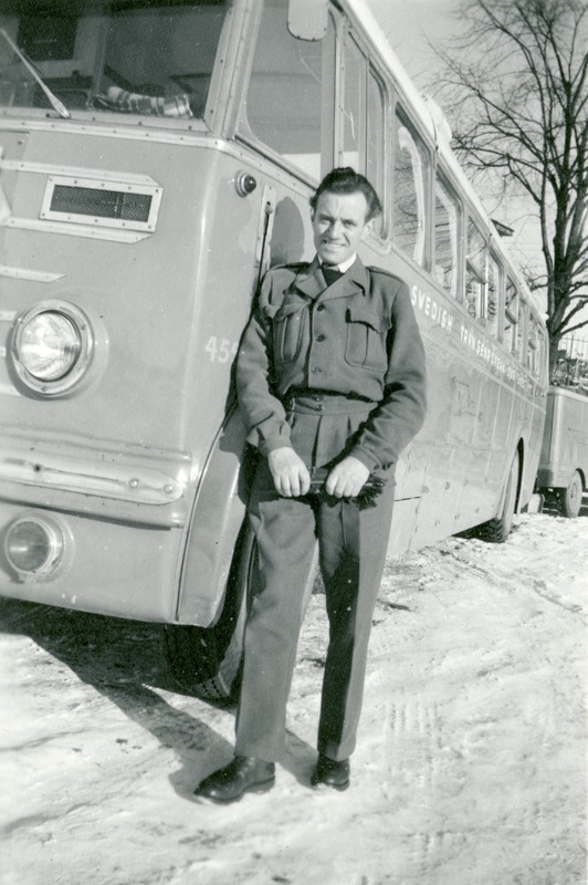 Svartvitt fotografi av en man i uniform ståendes intill en buss. Mannen står ungefär mitt i bild, ler och tittar in i kameran. Han håller sina handskar med båda händerna framför sig. Han lutar sig, med höger axel, lite mot bussens för. Hela bussens ena sida syns i bild bakom mannen. Den löper från bildens vänsterkant till mitten av högerkanten. Bakom bussen finns ett påkopplat släp. I bakgrunden syns ett träd. På marken ligger det ett tunt lager snö.