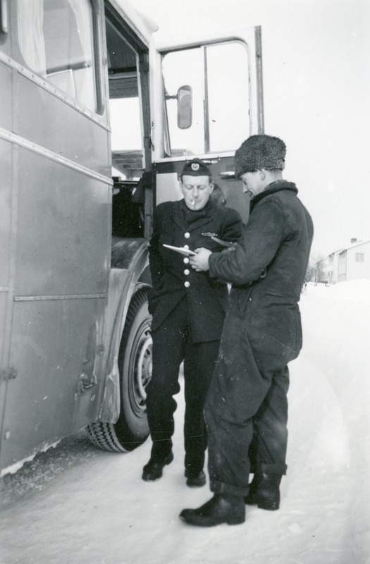 Svartvitt fotografi av två män ståendes bredvid en buss. Männen står ungefär mitt i bild med bussen åt vänster i bild. Åt höger, i bakgrunden, ser man ett par byggnader och några mindre träd eller buskar. Männen står precis bredvid dörren till bussens för, som står öppen. Mannen närmst bussen har en cigarett i munnen, är klädd i uniform och har sin högra hand i byxfickan. Han tittar på något som den andra mannen, som står i profil lite längre åt höger i bild, håller i sin vänsterhand. Det ser ut som en bok eller en skrivplatta för papper. Mannen har en stor pälsmössa på sig. Marken är täckt av snö.