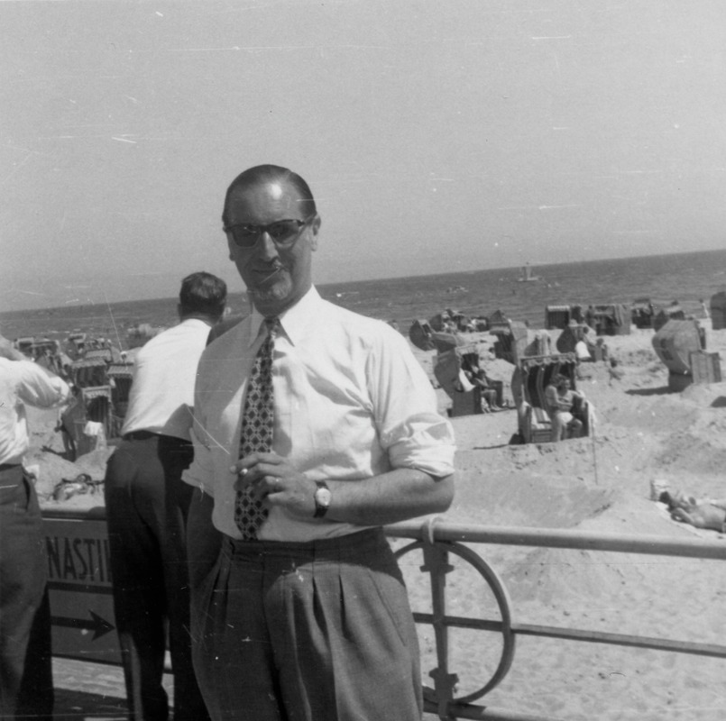 Svartvitt fotografi av en man framför en badstrand. Han står vänd mot kameran med sin högra hand i byxfickan och en cigarett i den vänstra. Han är iklädd kostymbyxor, vit skjorta och mönstrad slips. Han har även solglasögon. En bit bakom honom löper ett metallstaket som avgränsar mot stranden. Vid staketet, till vänster i bild, står två män med ryggen mot kameran. Den ena lutar sig lite framåt över staketet. Mellan dem, på staketet, skymtar en skylt. Det enda som går att utläsa på den är "NASTI…". Solstolar står utspridda över stranden och det ser ut att sitta personer i flera av dem. På andra sidan vattnet går det att ana mer land.