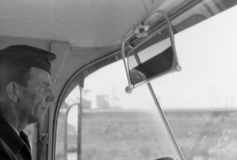 Svartvitt fotografi av en busschaufför som kör buss. Mannen är fotograferad i profil och placerad i bildens nedre, vänstra kant. Utsnittet gör att endast mannen ansikte, hals och lite av hans axelparti är synligt. Han är iklädd uniformsmössa. I övrigt syns enbart delar av hans kavaj, vilken troligen är en uniform. Framför mannen, åt höger i bild, syns bussens vindruta samt en backspegel. Bussens sidospegel, på dess vänstra sida i färdriktningen, syns genom vindrutan. Utanför skymtar ett landskap som ej är tydlig på grund av bildens skärpedjup.