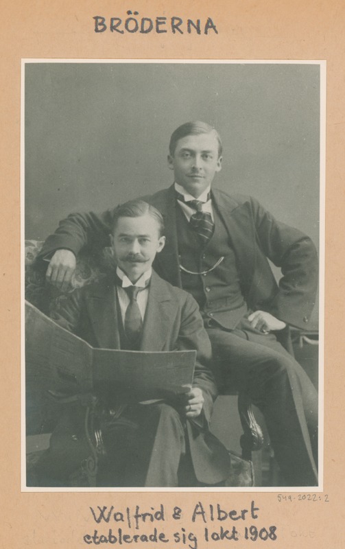 Porträtt av bröderna Walfrid och Albert Hense. Walfrid sitter ned på en karmstol med en uppslagen tidning i knäet. Albert sitter på stolens karm med armen lutad över ryggstödet.