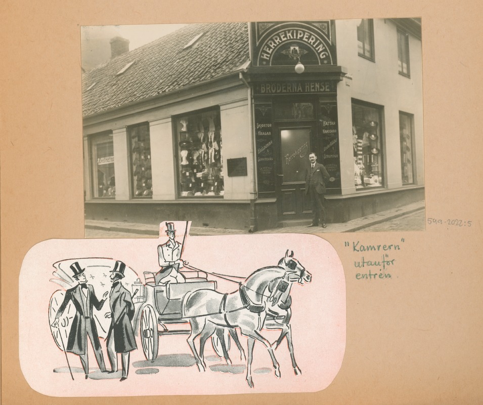 Exteriört fotografi av bröderna Henses herrekipering. Utanför står en man, troligen Walfrid Hense.