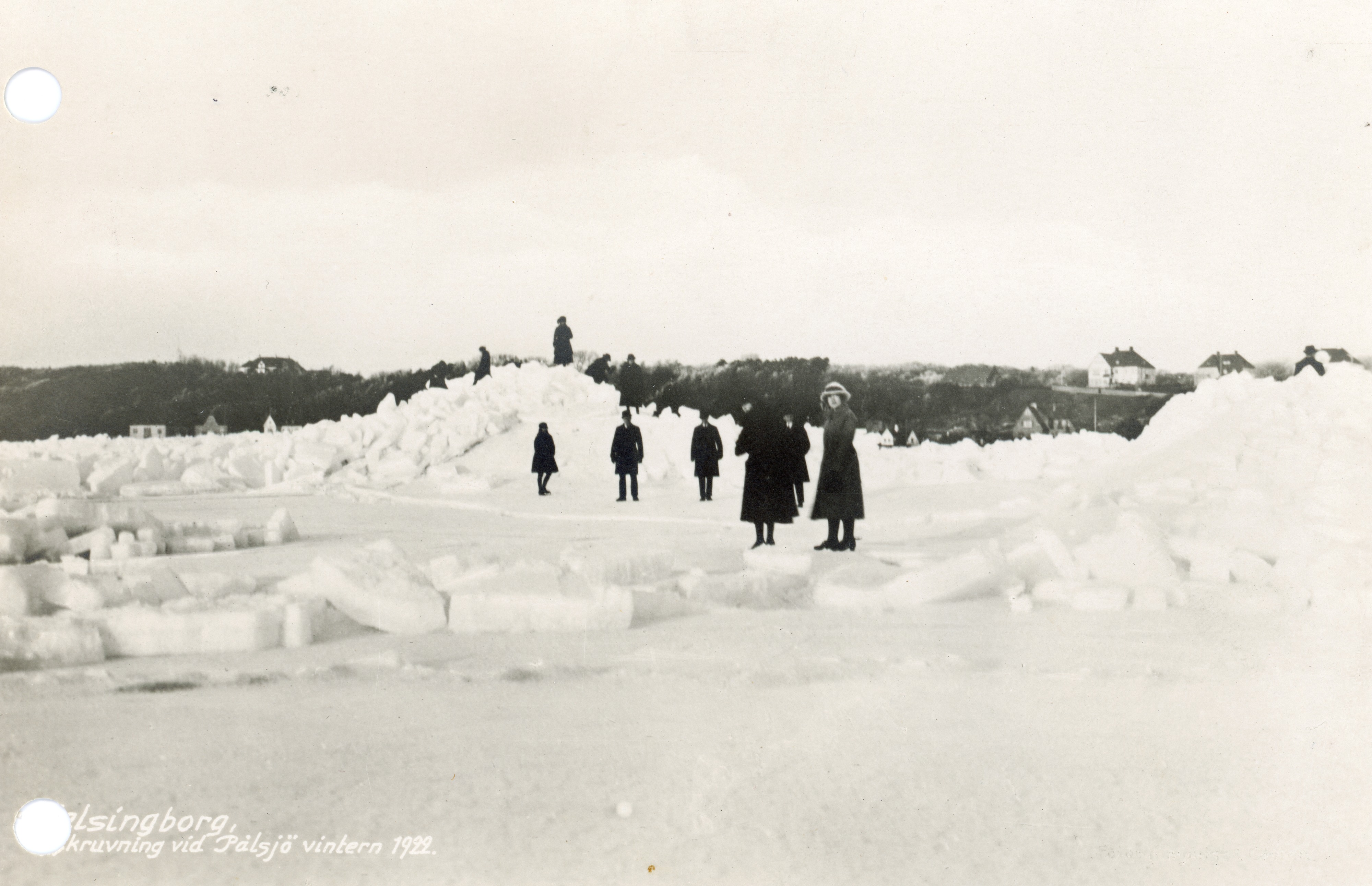 Bilden föreställer isskruvning på havet vid stranden i Pålsjö. Där står flera människor och i bakgrunden stadsbebyggelse.