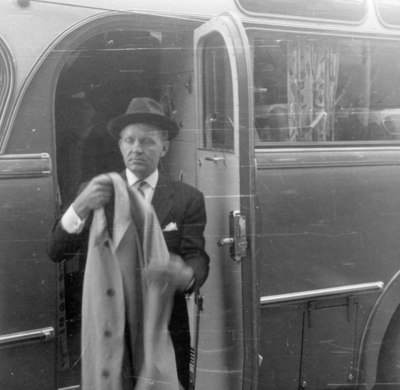 Svartvitt fotografi av en man på väg att gå av en buss. Mannen står troligtvis på det nedersta trappsteget i dörröppningen i bussens bakre del, åt vänster i bild. Han är iklädd kostym och hatt och håller en ljus ytterrock framför sig.
