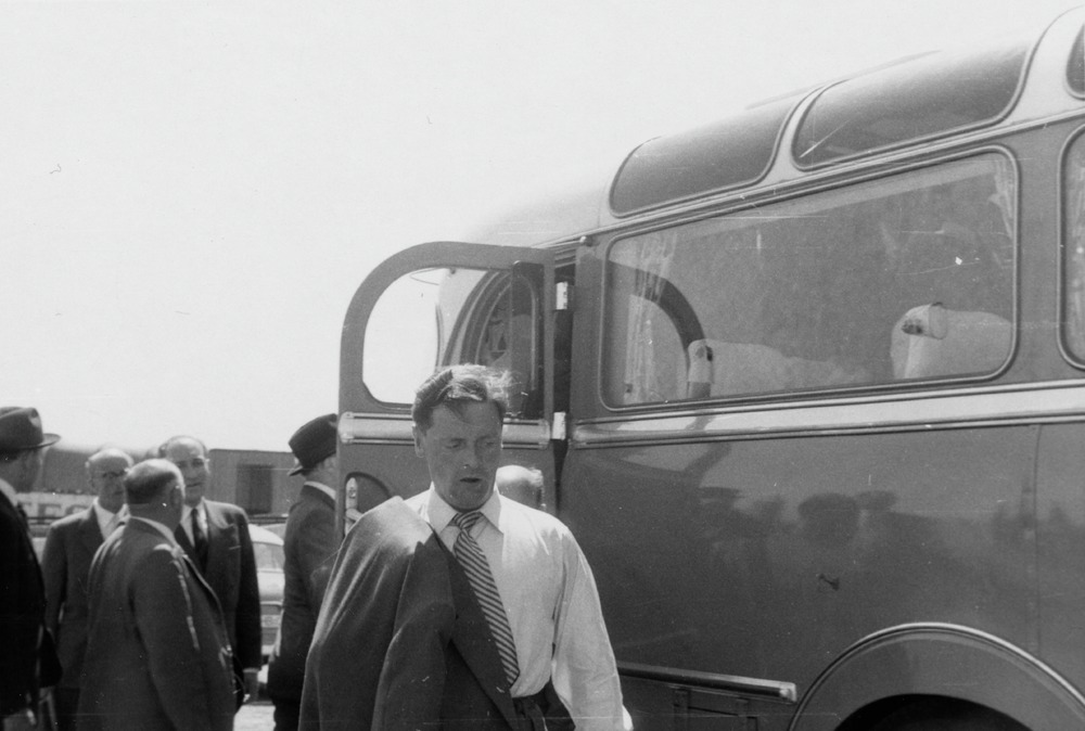 Svartvitt fotografi av ett antal män utanför en buss. Mannen närmst kameran står ungefär mitt i bild, vänd mot kameran, med en kavaj slängd över sin högra axel. Han tittar neråt åt bildens högra hörn. Bakom honom, åt vänster i bild, står en grupp om fem män som ser ut att vara på väg ombord bussen genom dessa bakre dörr. Bussen upptar bildens högra del. I bakgrunden, bakom männen, skymtar en bil och möjligen en tågvagn eller mindre byggnad.