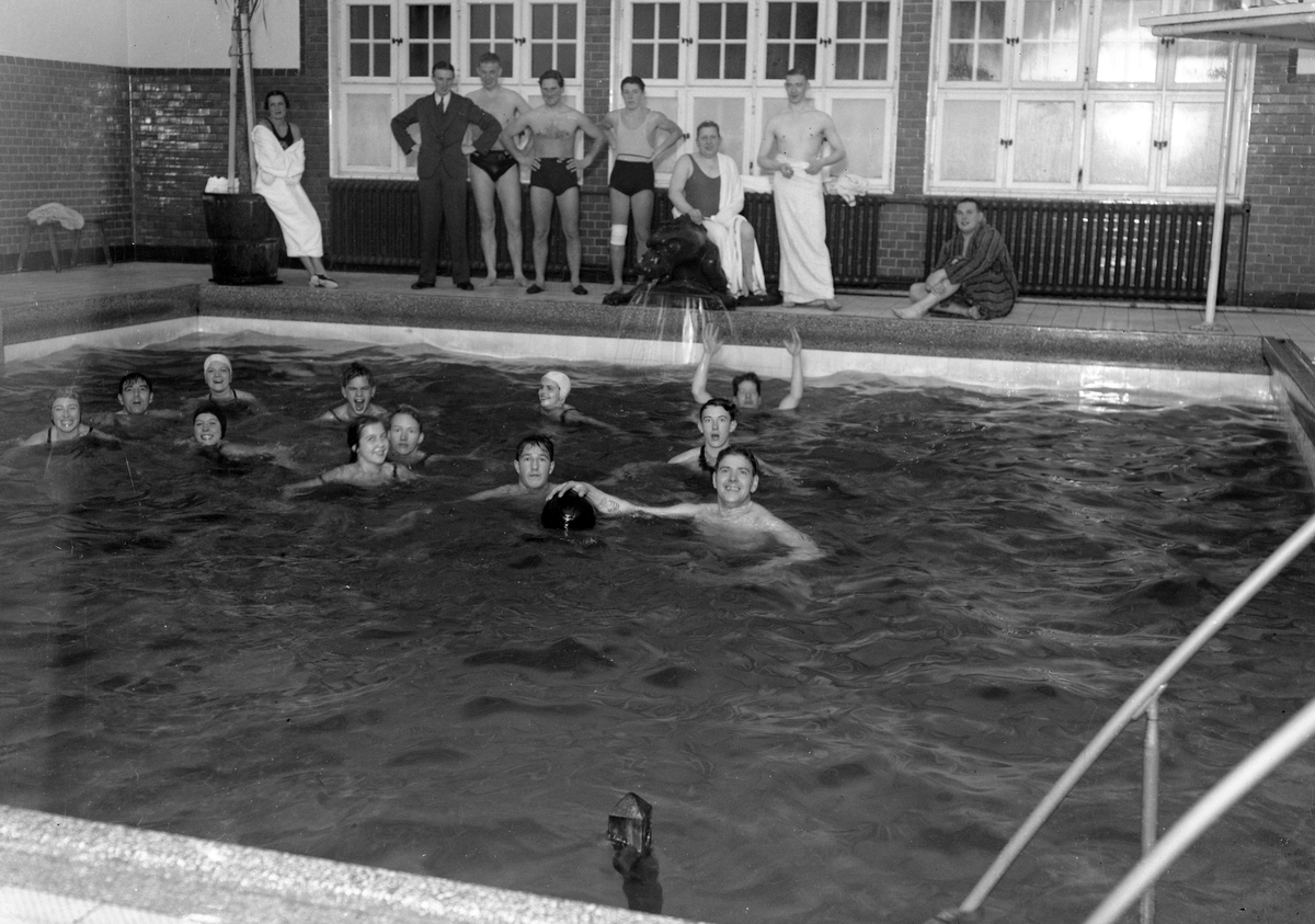 Foto av ett antal kvinnor och män som leker i bassängen på badhuset, Växjö.