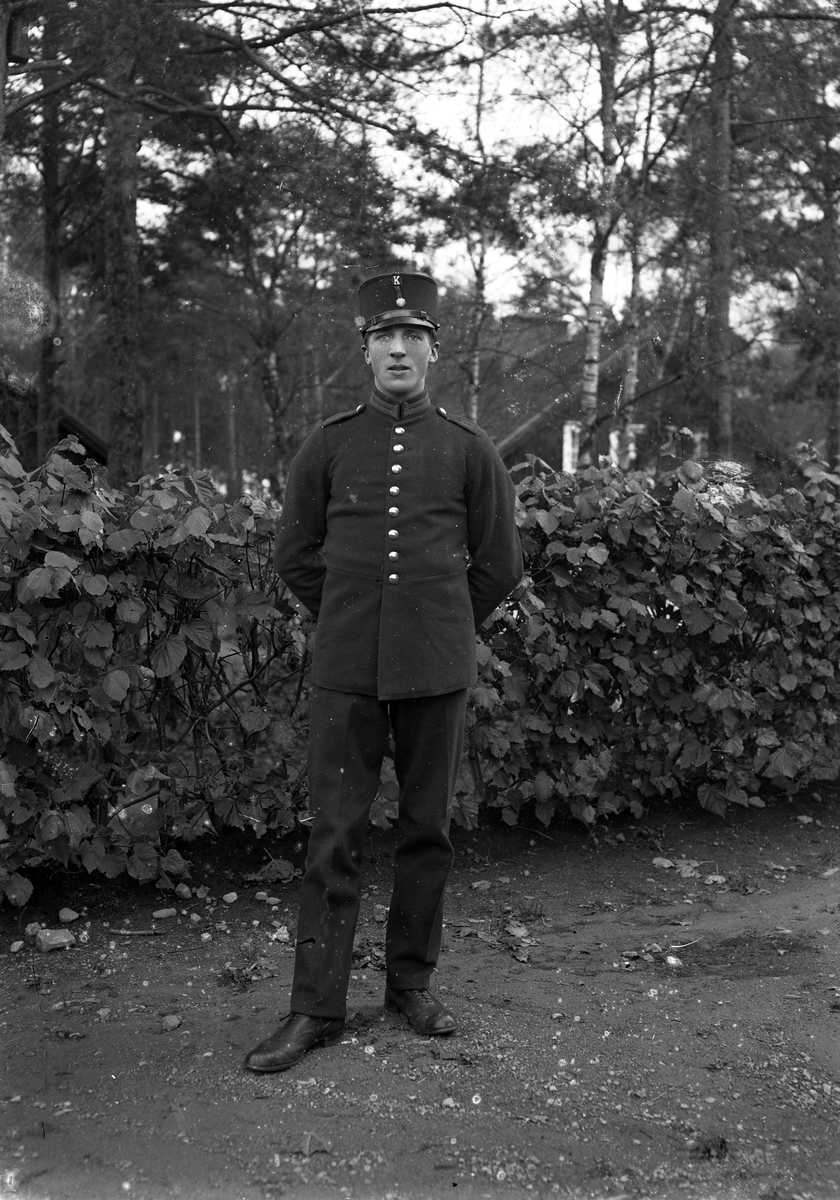 Foto av en man i mörk militäruniform, stående vid en häck.