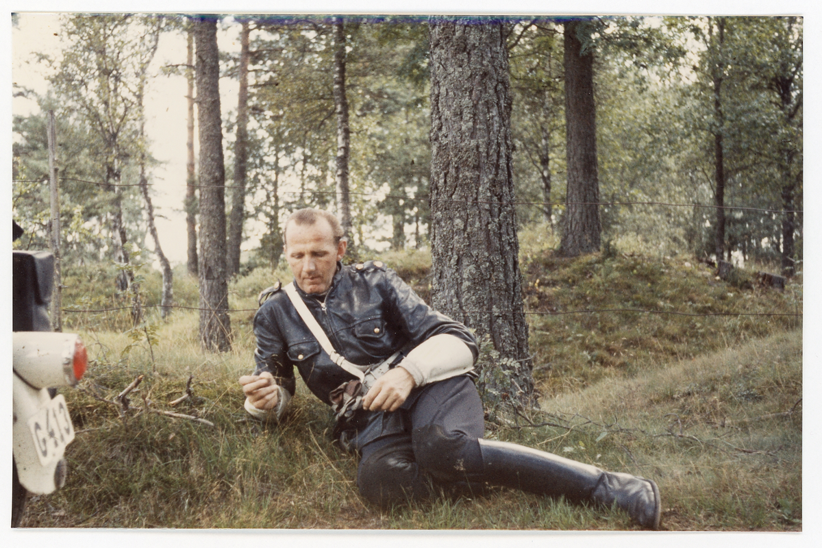 Börje Skoog vid statspolisen, Växjö, tar en paus i skogen 1958. Till vänster skymtar hans motorcykel.