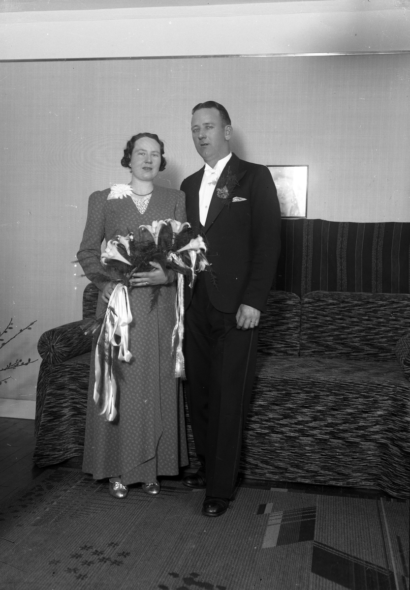 Foto av ett okänt brudpar i ett vardagsrum. Hon är klädd i färgad brudklänning utan slöja. Han bär mörk kostym med stärkkrage och vit fluga.