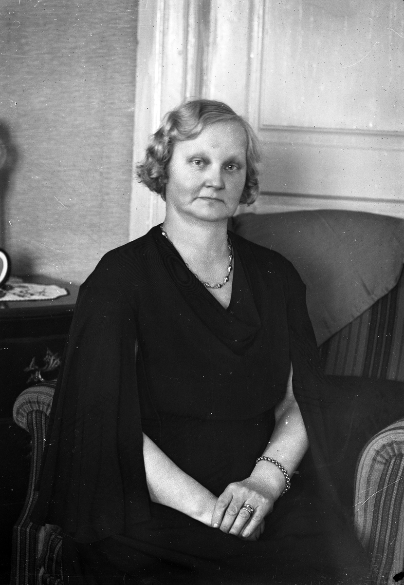 En okänd kvinna i mörk festklänning och halsband, poserar för fotografen. I bakgrunden skymtar en byrå.