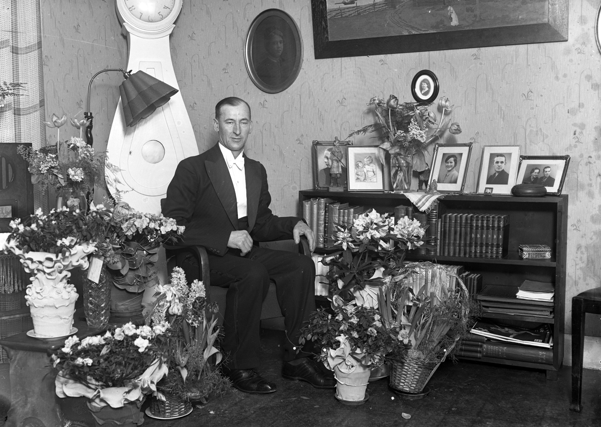 En man i frack sitter i en fåtölj framför en moraklocka.