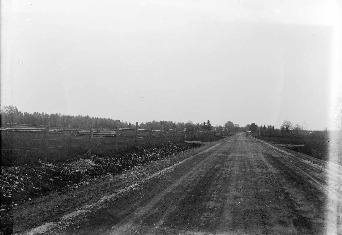 Landsväg med åkrar och ängar på sidorna. I bakgrunden skymtar en bil.