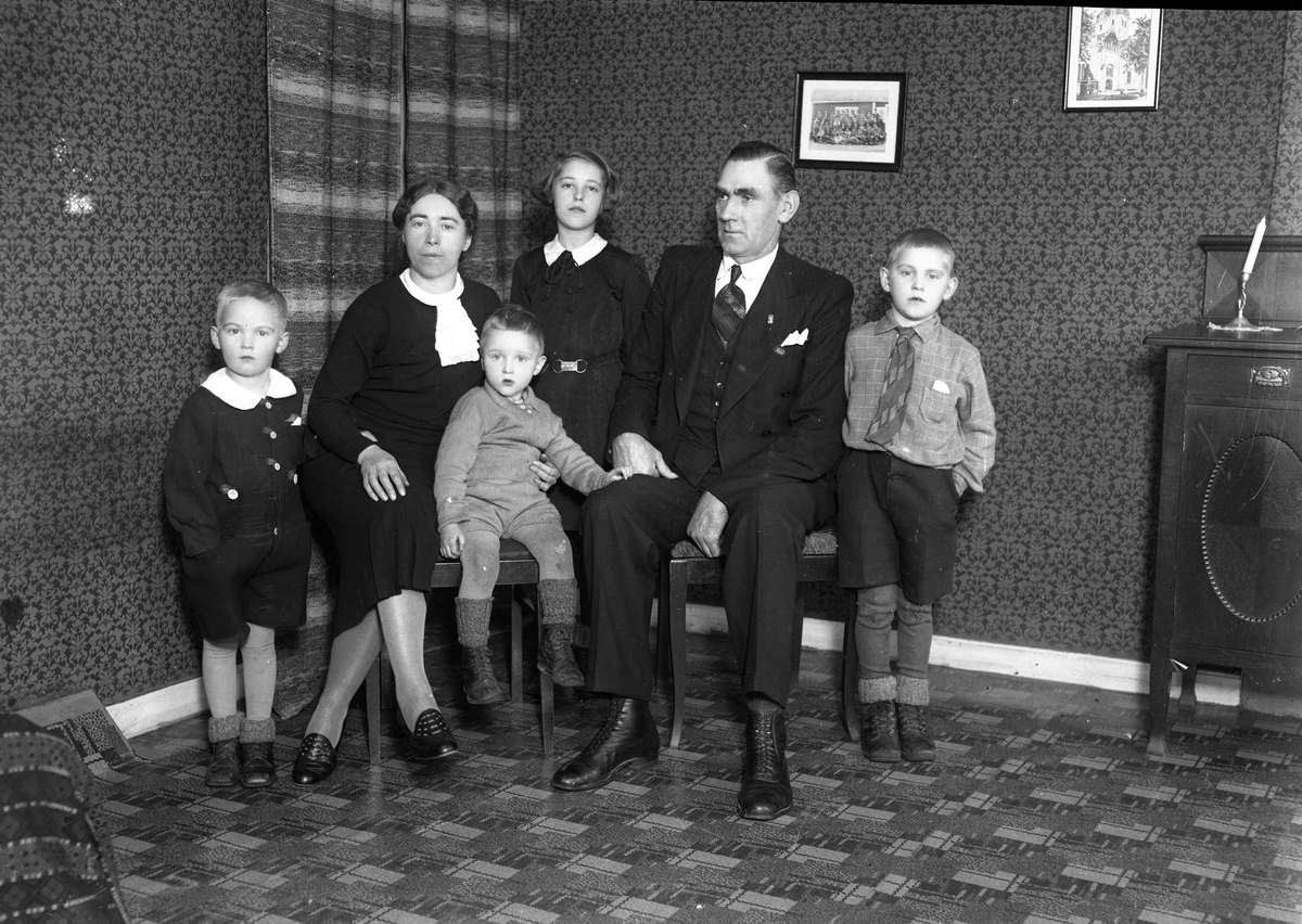 Grupporträtt av en familj med tre pojkar och en flicka som samlats i ett vardagsrum.